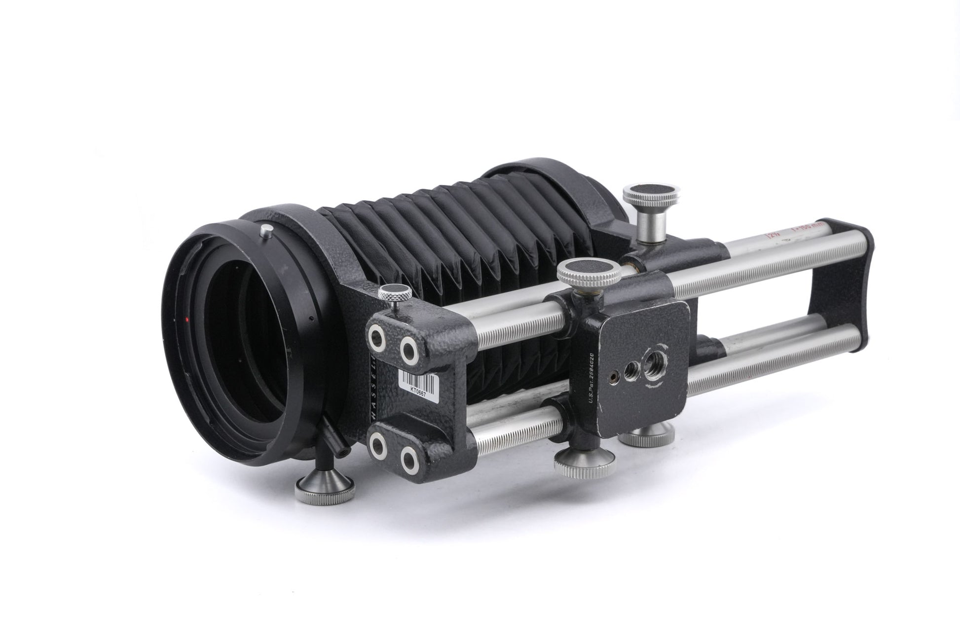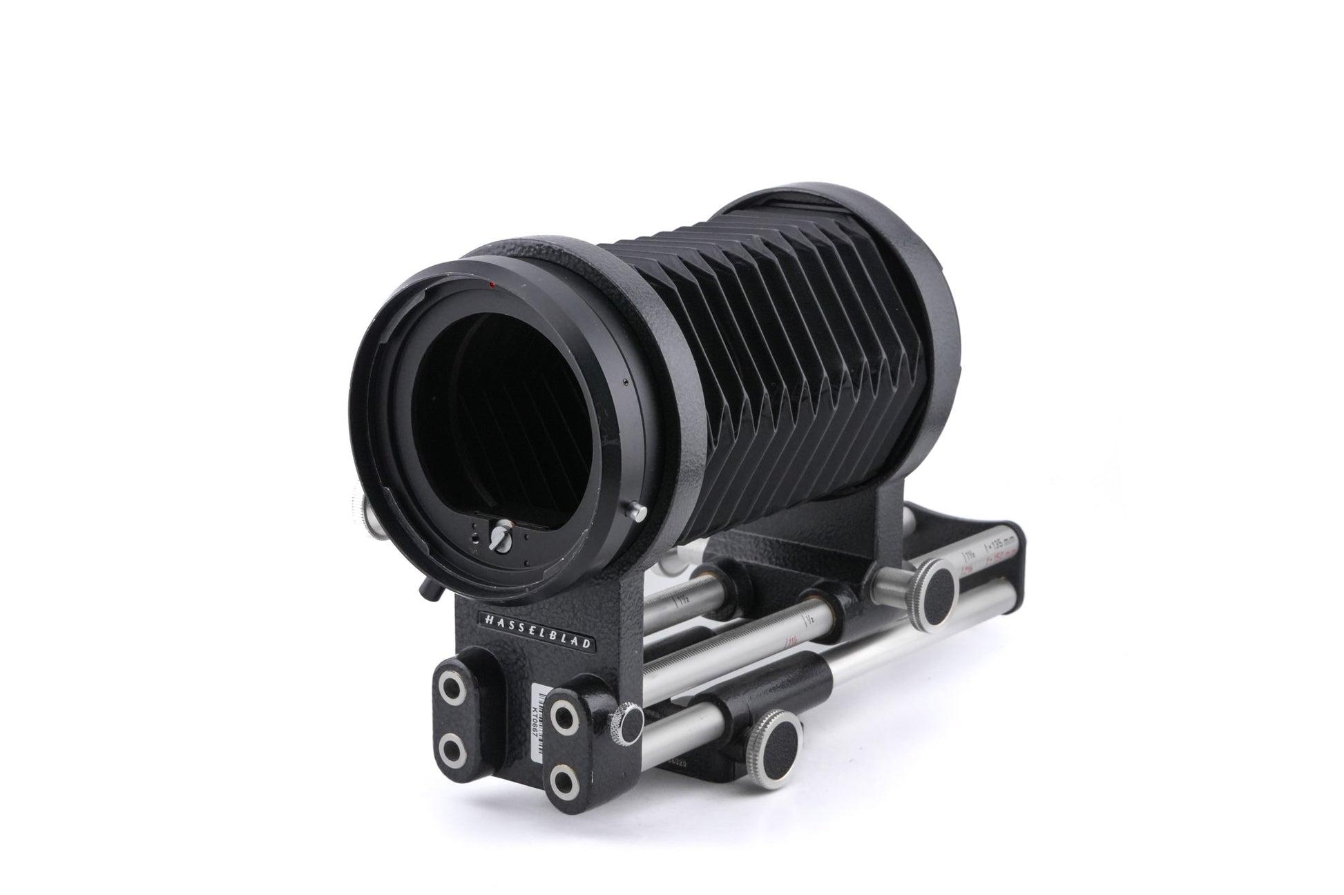 Macro bellows made for the Hasselblad V system cameras in West Germany by Hasselblad. Called the "round" bellows extension and was available between 1968 to 1982. Designed to be used with a 135mm lens, and with that lens has a focusing range from 53.5cm to infinity (1:1). Uses cable release 40142. Metal body available in black.