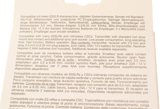 Wireless universal flash trigger. Both units have a male accessory shoe connection on the bottom and female on top.
