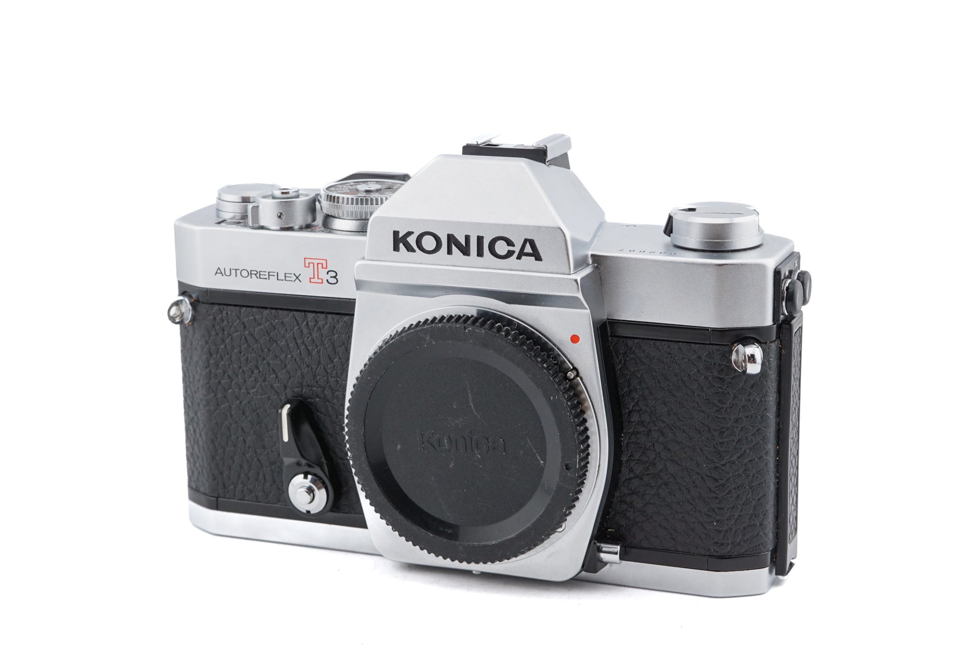 Manual focus AR-mount SLR camera made by Konica manufactured from 1974 to 1977. This was a slightly improved model of the T3 with the addition of a viewfinder curtain to block stray light during long exposures and a flattened and widened prism to accommodate a hot shoe. Some cosmetic changes also occurred. The name T3N does not appear on the camera itself. Metal body available in black, silver, and an exclusive gold-plated version.