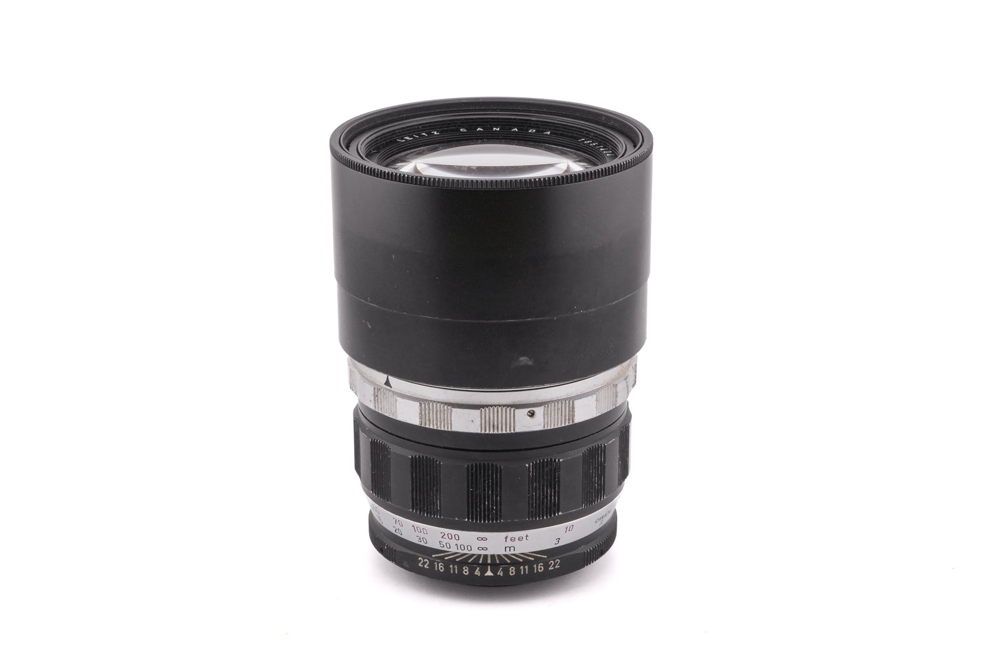 Manual focus telephoto lens made the M-mount Visoflex system introduced by Leica in 1960. It was designed to be used directly on the Visoflex I and on the Visoflex II, IIa, and III with the OUBIO adapter. The front lens head can be removed and used on the Bellows II via the 16498 adapter. It can also be mounted on M cameras with the TXBOO tube. It has a preset aperture and a built-in lens hood. The position of the diaphragm was at some point changed from being in front of the third element to behind it. Early examples have a chrome focusing and aperture ring; later examples are fully black. The lens also exists in a few chrome examples, but this finish does not seem to have ever gone into mass production. Metal body available in black (11063).