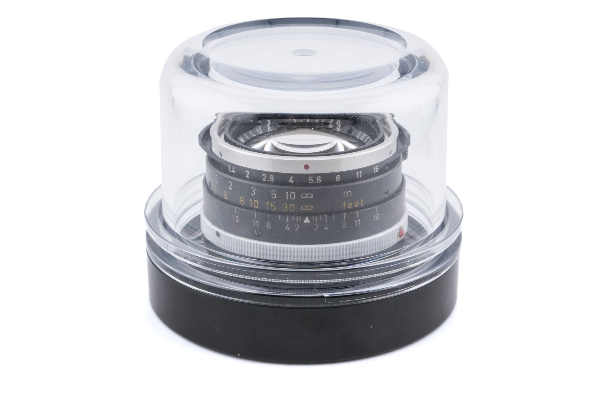 Manual focus wide normal lens made for M-mount rangefinder cameras introduced by Leica starting in 1961. This was the first 35mm f1.4 Summilux that Leica made. It was made for the M2 and uses 7 spherical elements. This Type I lens uses E41 filters and the OLLUX 12522 hood. It was later changed in 1966 (Type II) to use Series VII filters and the 12504 hood. Metal body available in black with a chrome front ring (11869).