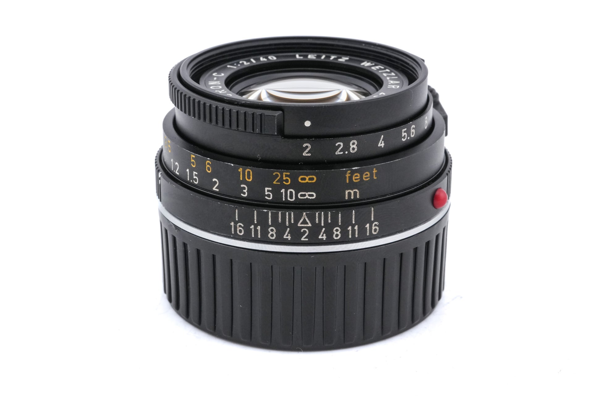 Manual focus wide normal lens made for M-mount rangefinder cameras introduced by Leica in 1973. It was designed specifically to work with the Leica CL and Minolta CLE, both of which have 40mm frame lines built in. It will bring up 50mm frame lines on other M-mount cameras. Metal body available in black (11542).