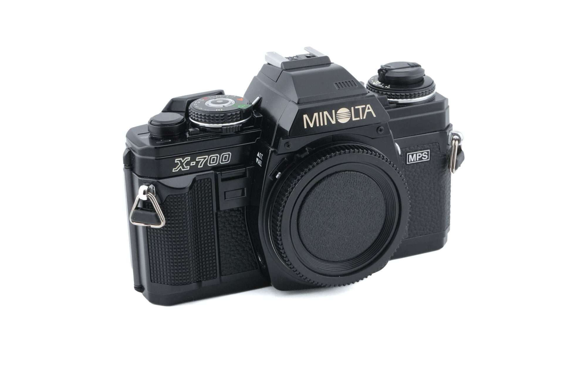 Manual focus MD mount 35mm SLR released by Minolta in 1981. It was the top model of their manual focus SLR series before the launch of the Minolta AF system. "MPS" on the front stands for "Minolta Program System". The camera features manual controls, aperture priority, and program modes. Plastic body available in black.