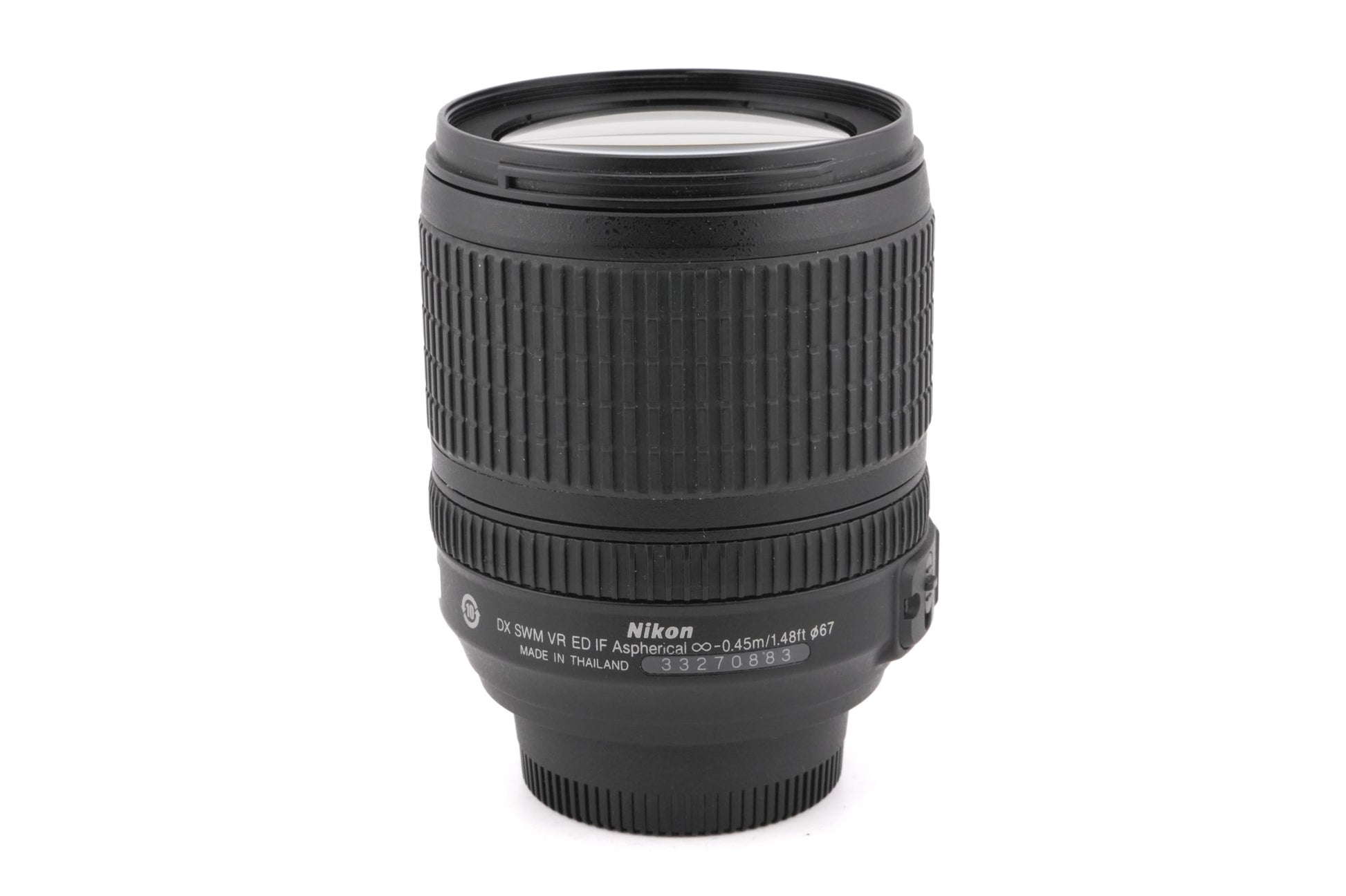 Autofocus telephoto zoom lens made for DX-mount digital SLR cameras by Nikon. It is designed for APS-C-sized sensors and gives the equivalent field of view to a 27-158 mm lens on full frame/35mm. It has image stabilization (VR). Plastic body available in black.