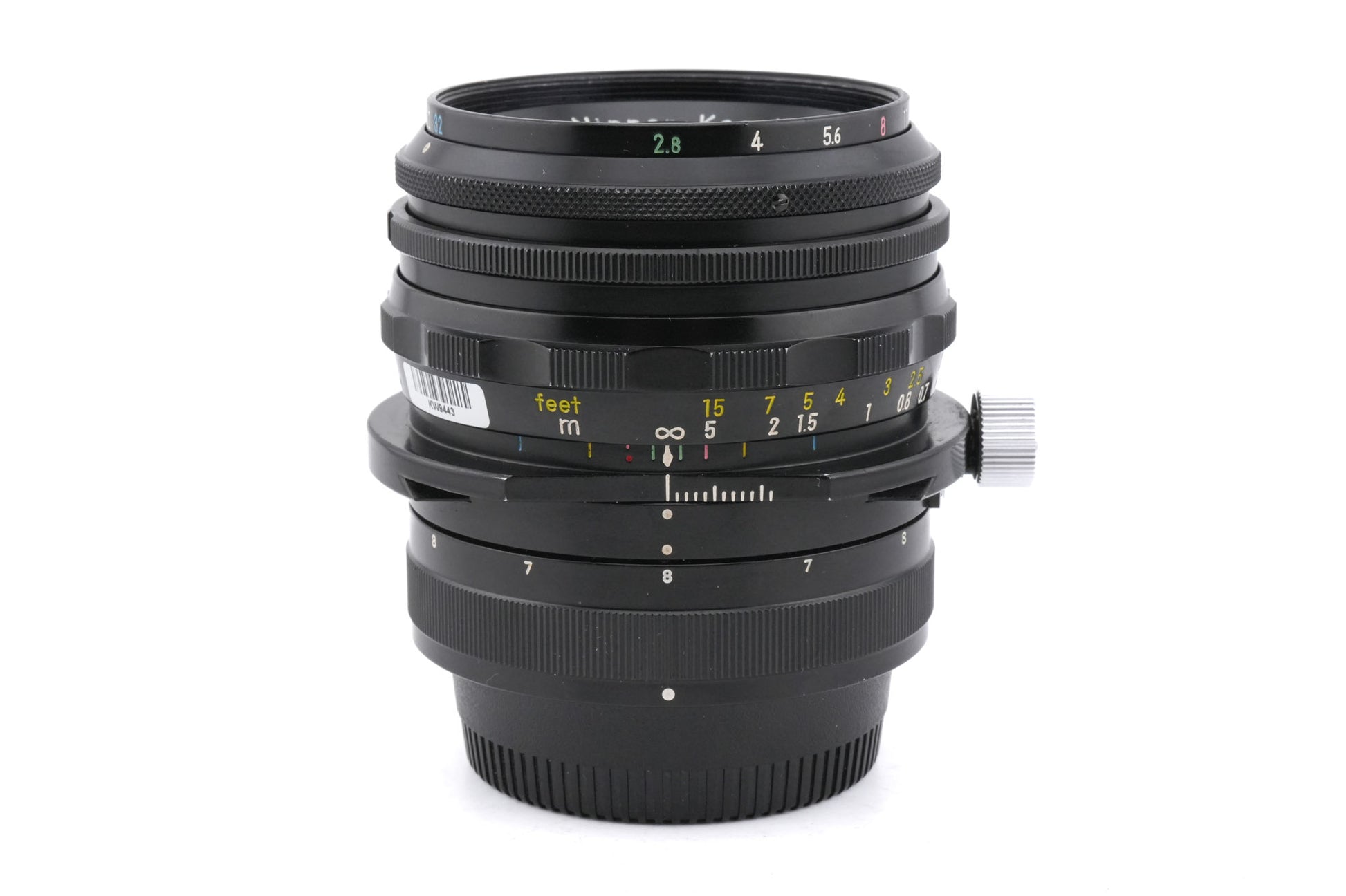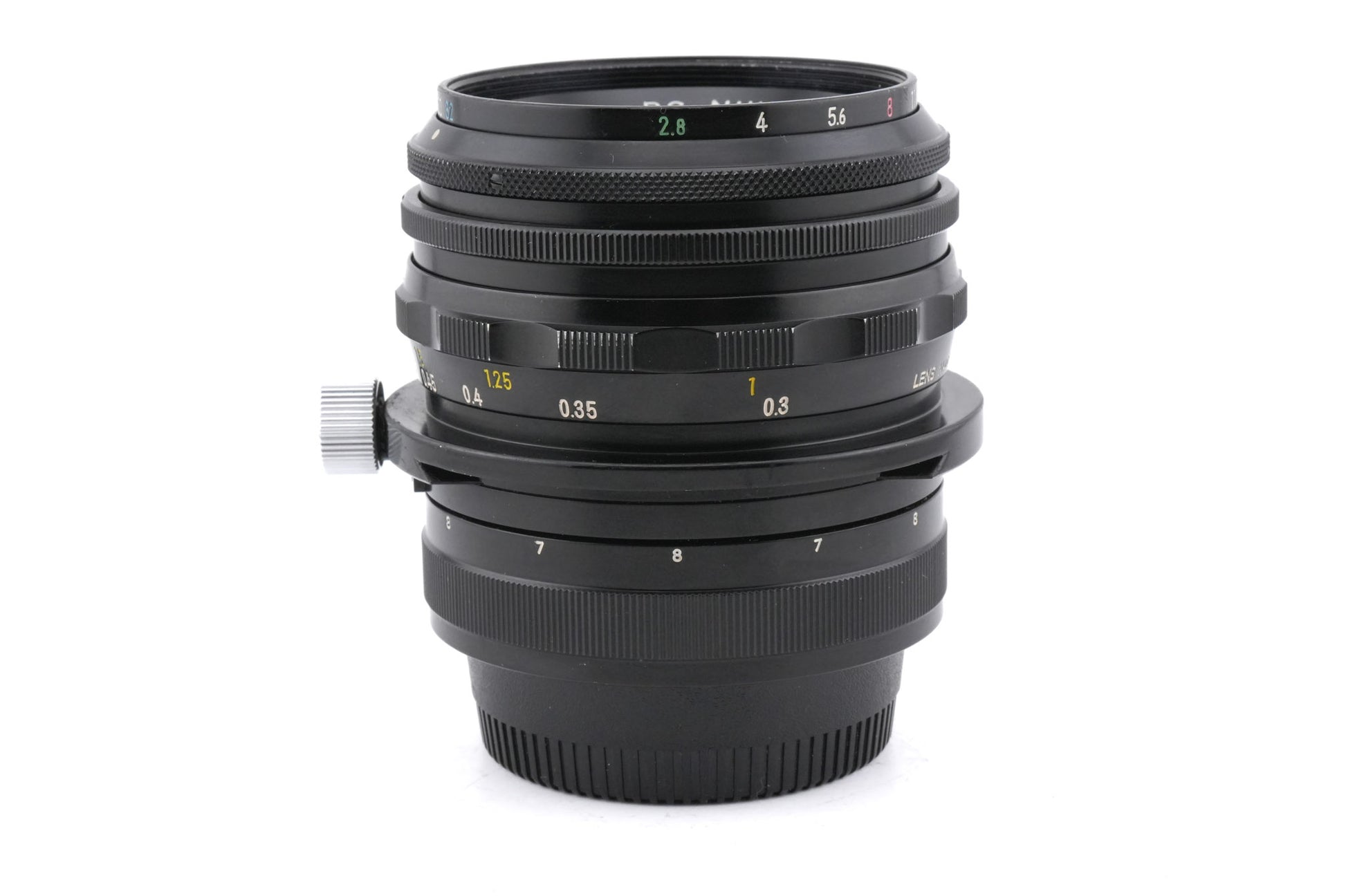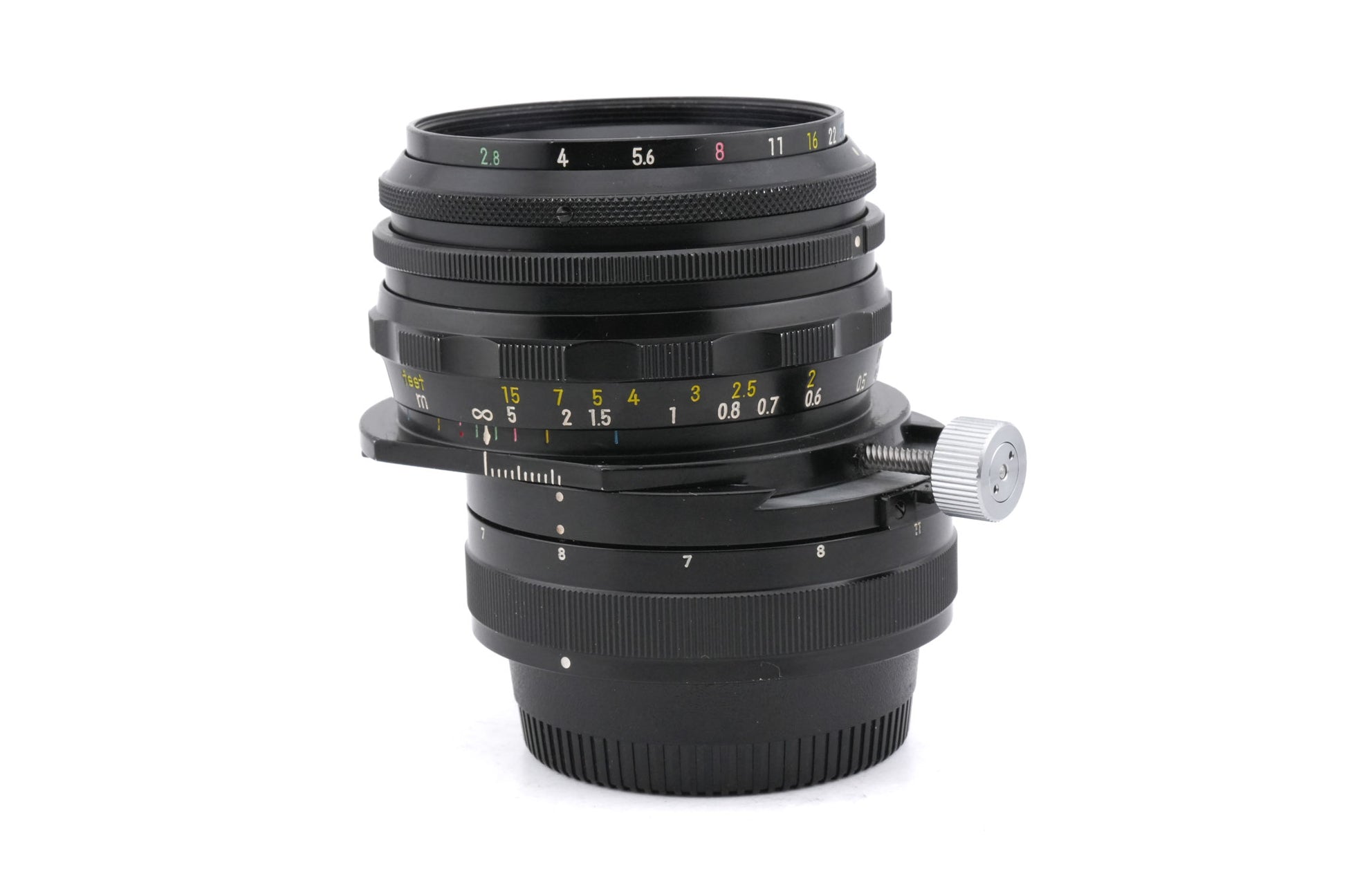 Manual focus wide normal perspective control (PC) lens made for F mount SLR cameras by Nikon starting in 1972. This is the later version with a different optical formula than earlier PC-Nikkors. Because of the shift function, the lens cannot communicate aperture information to the body and does not have automatic aperture stop-down. It has a rotating barrel and 11mm of shift range. The exterior design was changed throughout production. Metal body available in black.