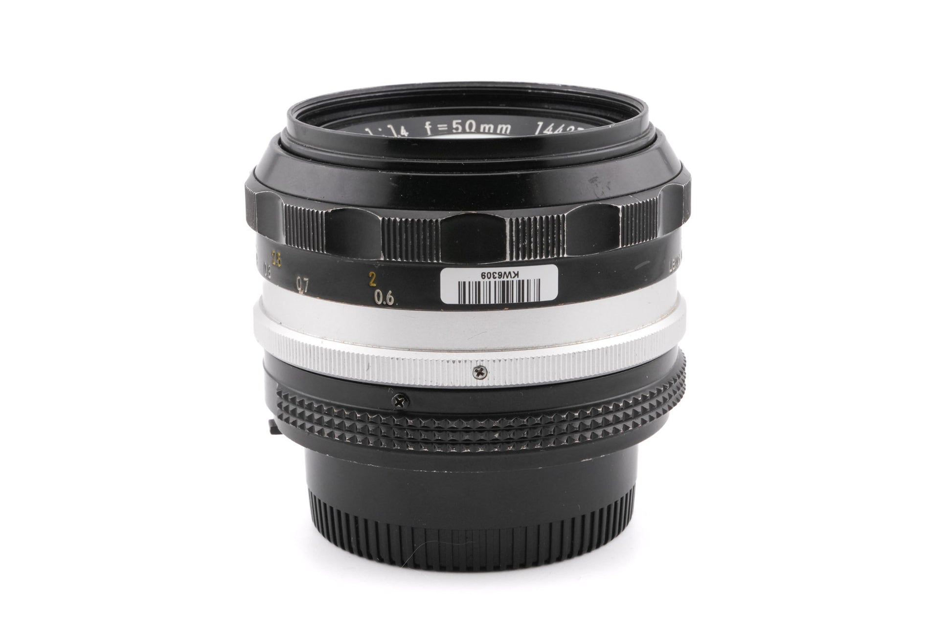 Manual focus normal lens made for F-mount 35mm SLR cameras introduced by Nikon in 1973. This version of the 50mm f1.4 has multicoating (C). It has bunny ear metering prongs but no AI ridge or AI-S indent, so it will only meter properly on older (F, F2, and Nikkormat) F mount SLRs and will not work with the advanced program modes of later models. Metal body available in black/silver.