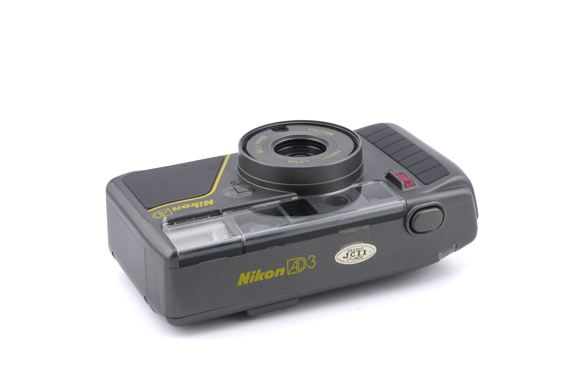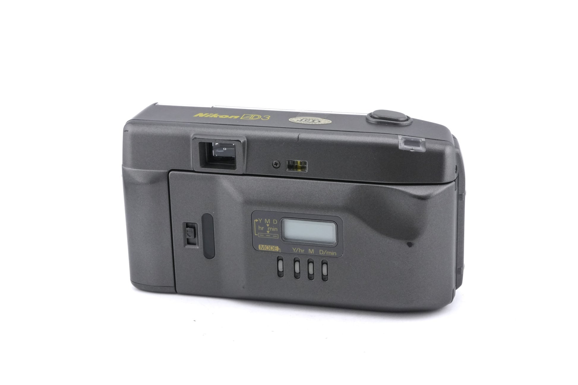 Autofocus 35mm compact camera introduced by Nikon. This is a version of the Nikon AF3 that includes a data back for automatic date imprinting on the film. Plastic body available in grey.