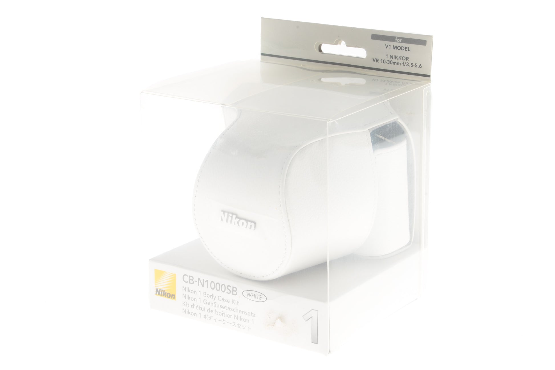 White leather case for Nikon 1 V1. Has room for mounted Nikon 10-30mm f3.5-5.6 VR (and other similar sized or smaller) lenses.