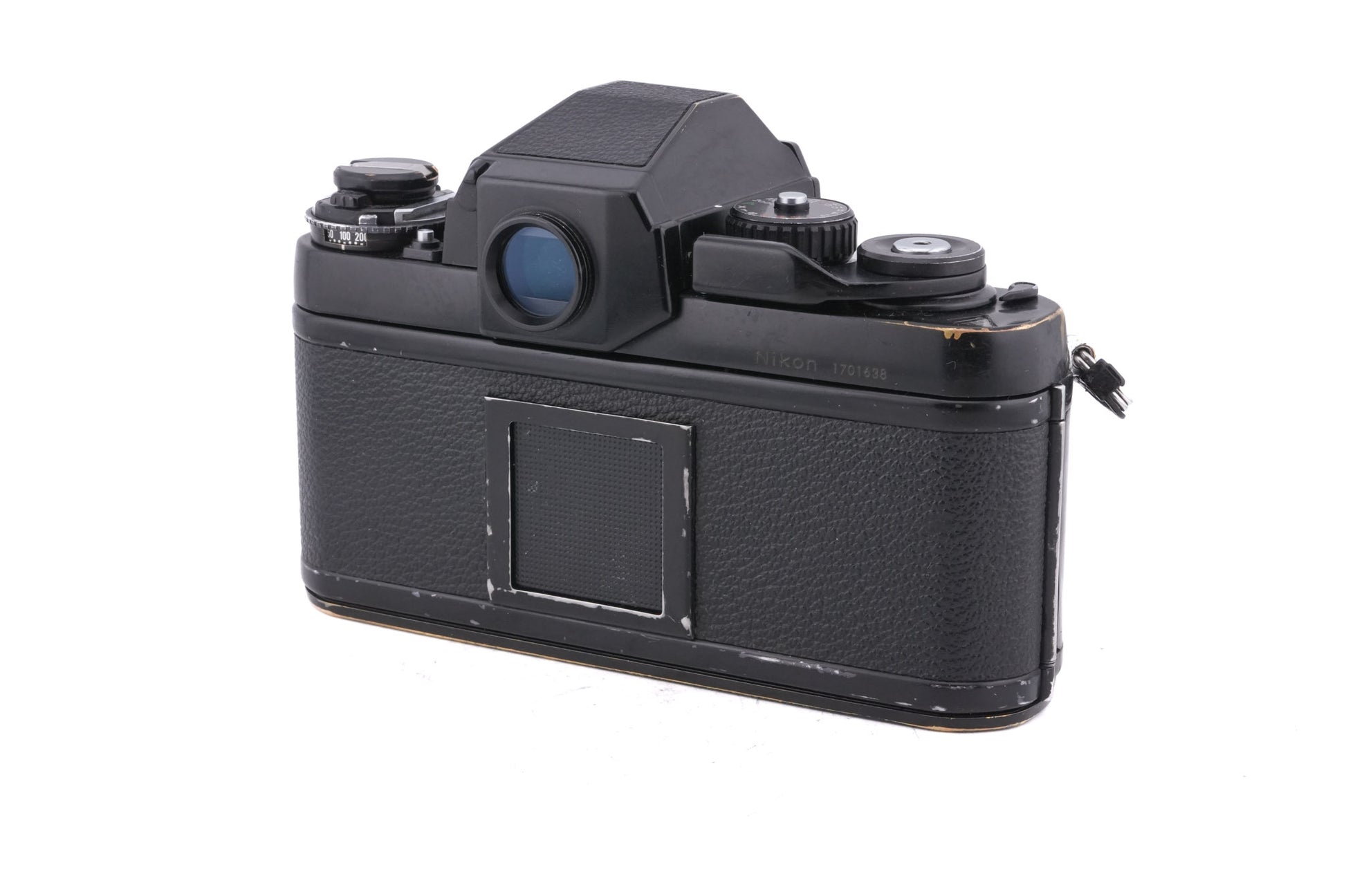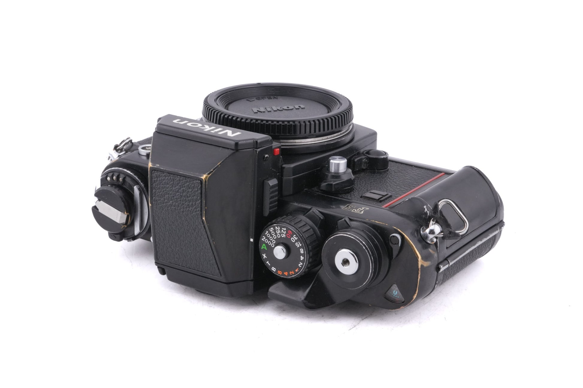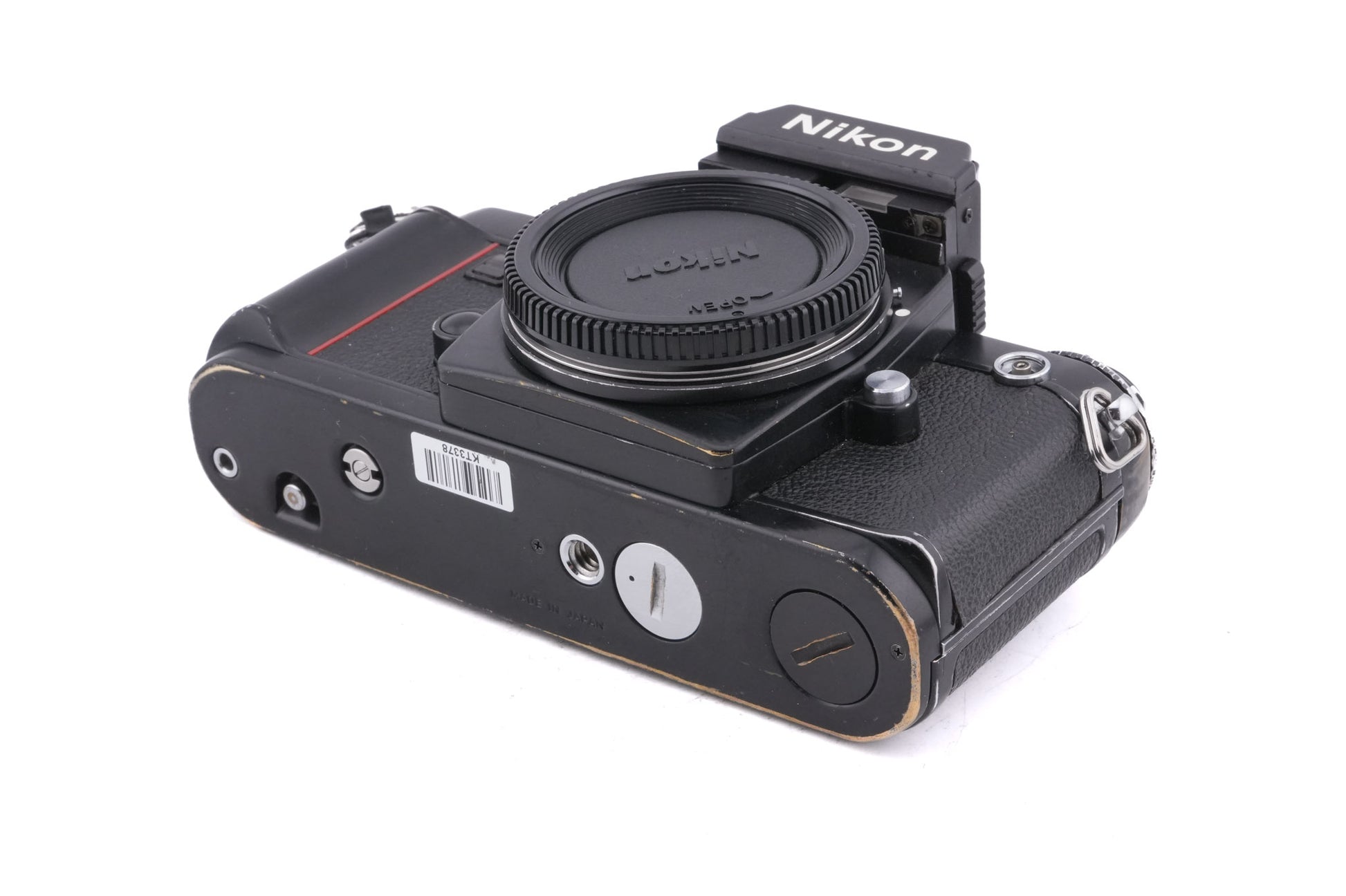 Manual focus F-mount 35mm SLR camera released by Nikon in 1980. It was the first professional Nikon SLR to feature an electronically controlled shutter but it featured the same amount of customizable prisms, grips, and focusing screens as previous models. It was also the first of numerous Nikon F-series cameras to be styled by Italian designer Giorgetto Giugiaro and include a red stripe on the handgrip. This model is an F3 body with a DE-2 standard eye-level finder. Metal body available in black.