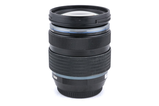 Autofocus zoom lens made for Micro Four Thirds mount mirrorless digital cameras by Olympus. The lens is designed for Micro Four Thirds-sized sensors and gives the equivalent field of view to a 24-80mm lens on full frame/35mm. It has IEC Standard publication 60529 IPX1 splash protection (when paired with a splashproof body) as well as dust protection. Metal body available in black.