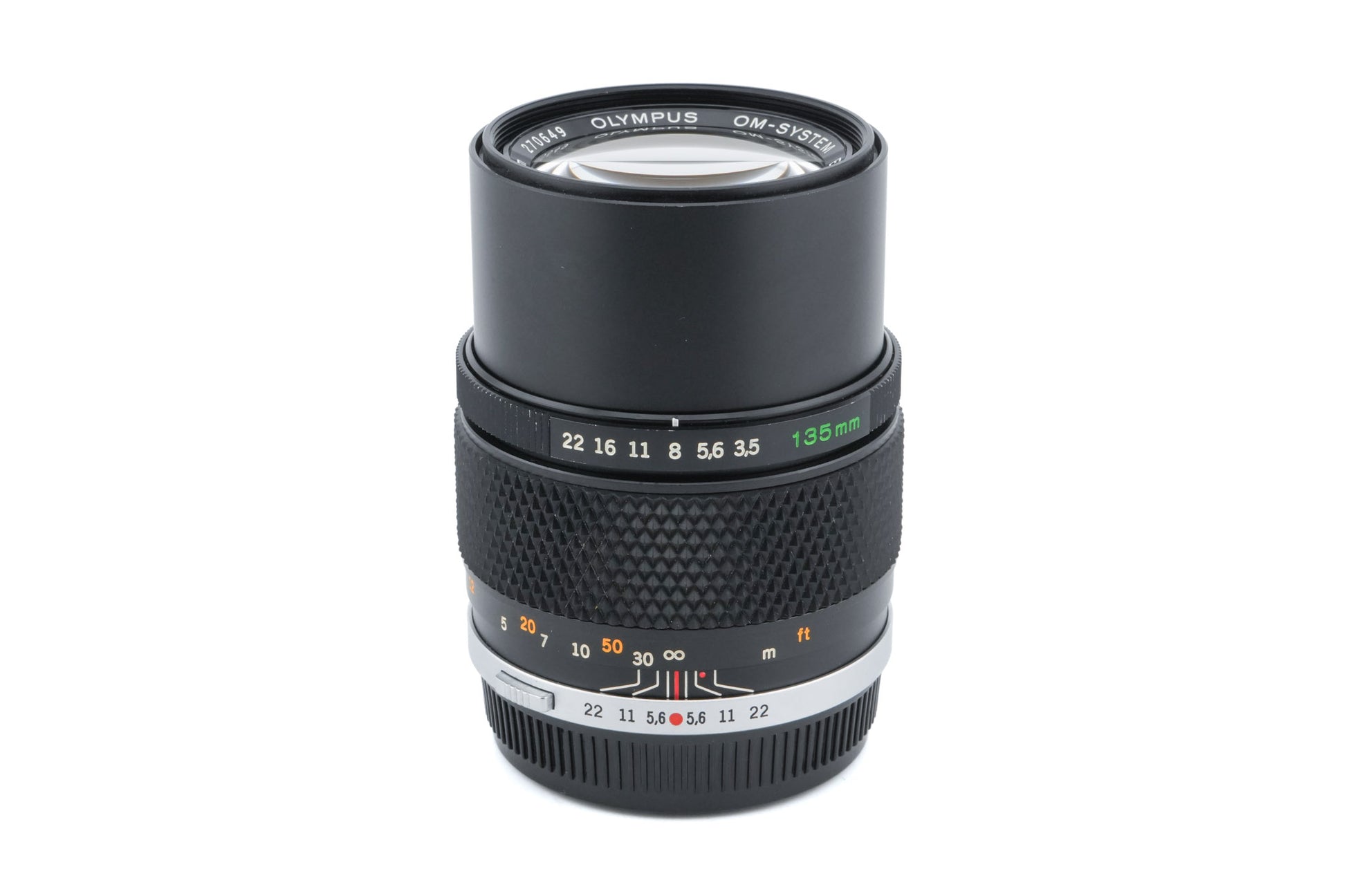 Manual focus telephoto lens made for OM-mount 35mm SLR cameras introduced by Olympus. It has a built-in lens hood. Metal body in black.