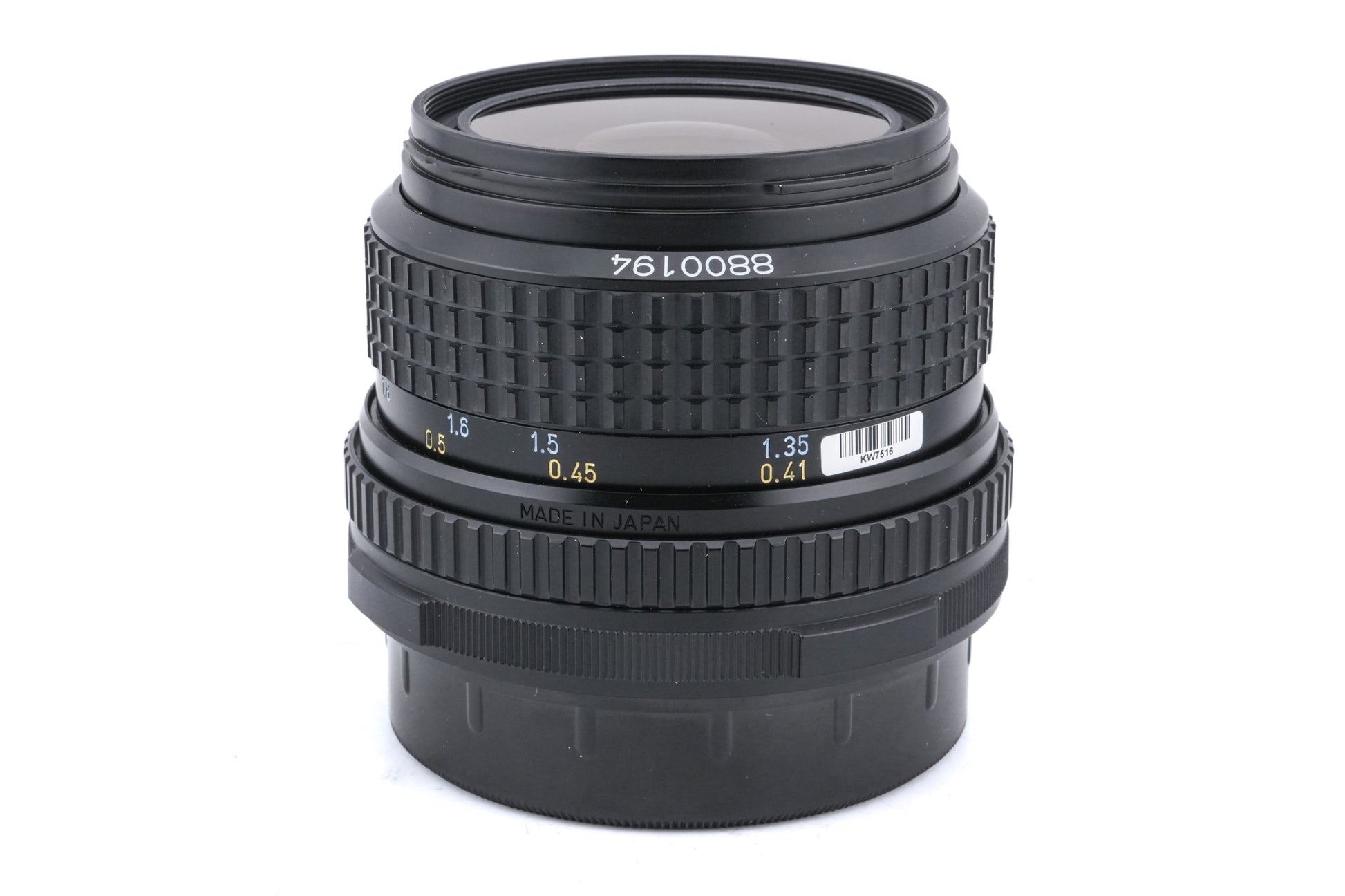 Manual focus wide normal lens made for 67 mount 120 SLRs by Pentax starting in 2001. It is one of the final lenses to be produced for the 67 system and features aspherical (AL) lens elements to improve image quality. It gives the equivalent field of view to a 37.5mm lens on full frame/35mm. Metal and plastic body available in black.