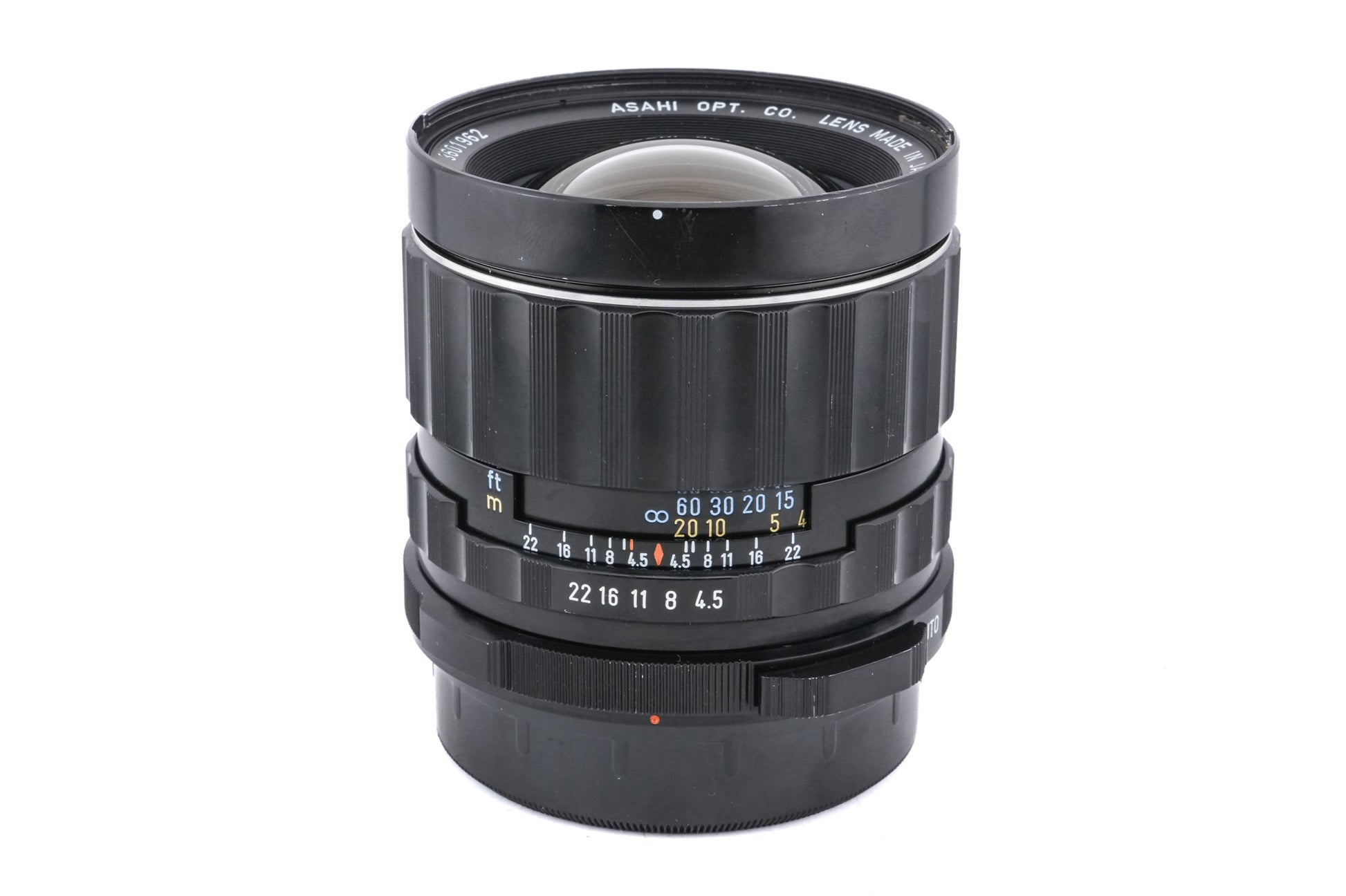 Manual focus wide normal lens made for 6x7 mount 120 SLRs by Pentax. It gives the equivalent field of view to a 37.5mm lens on full frame/35mm. Metal body available in black.
