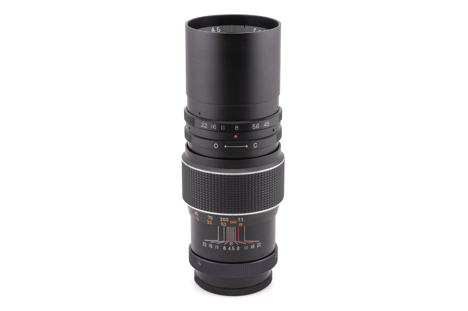 Manual focus telephoto lens made for M42 screw mount 35mm SLR cameras introduced by Pentor. Metal body available in black.