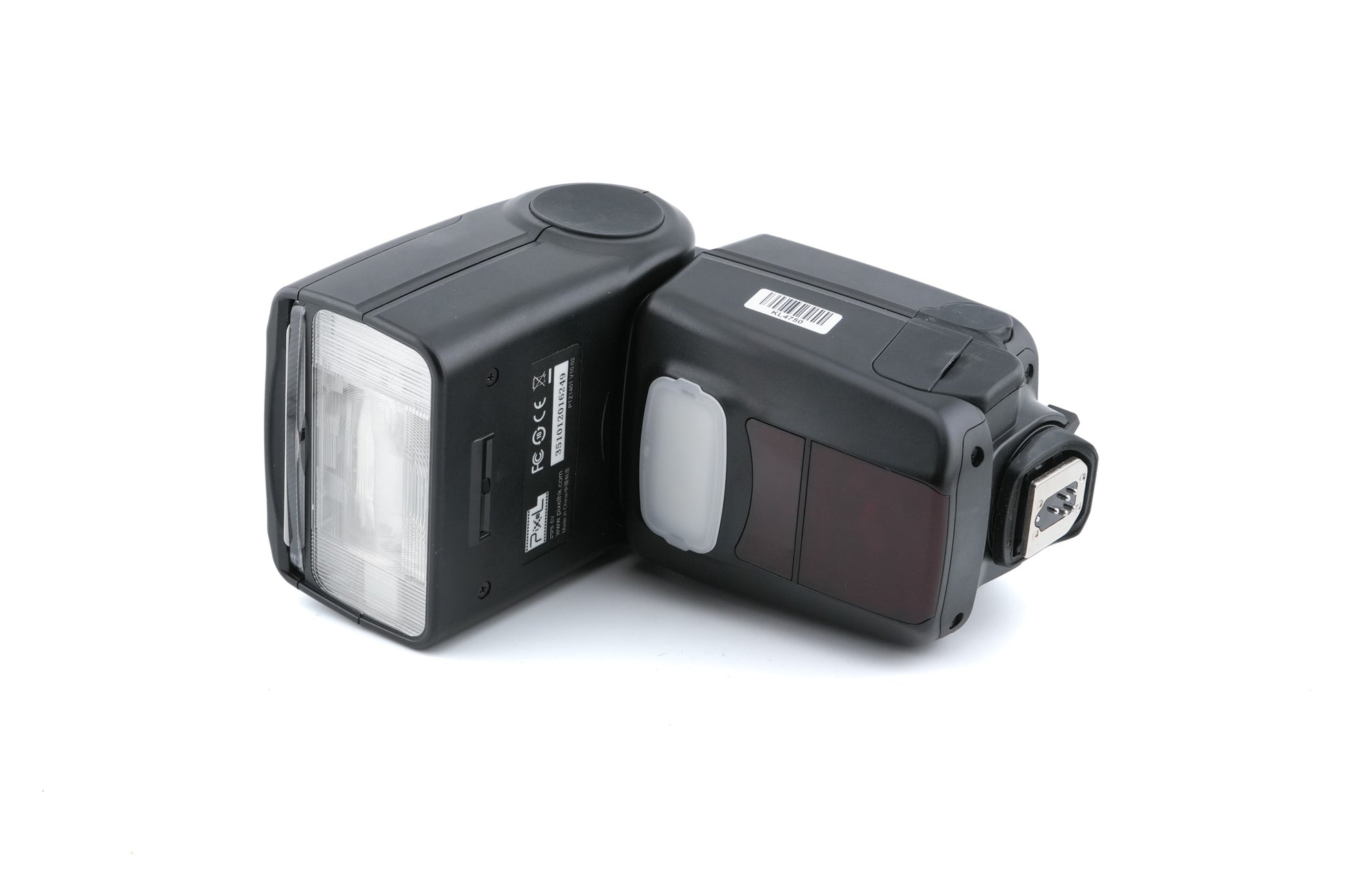 Flash made by Pixel. It features full 360 degree pan and 90 degree tilt. It has a PC-sync port and wireless maste and slave system optically. Plastic body available in black.