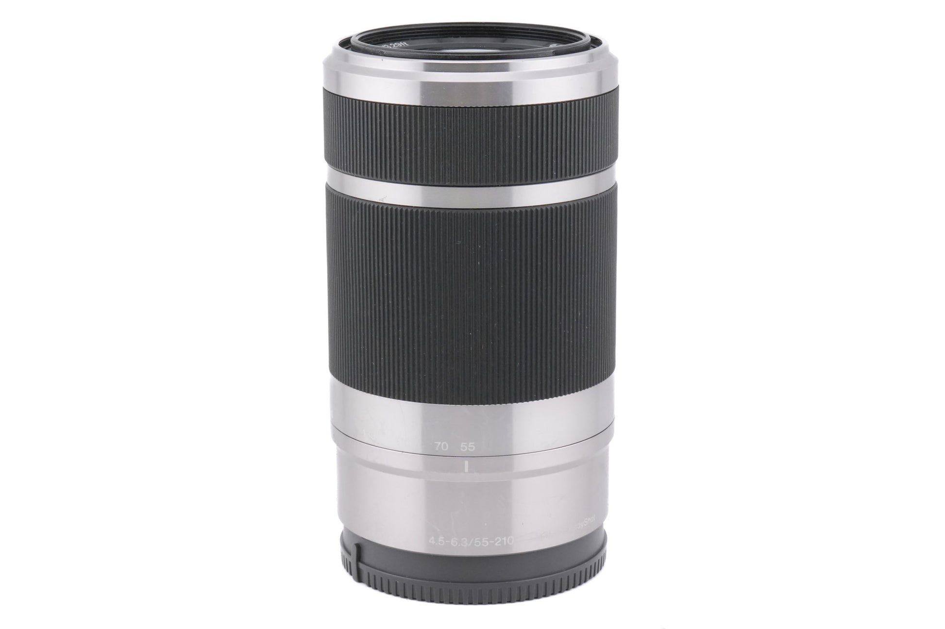 Autofocus telephoto zoom lens made for E-mount mirrorless cameras by Sony. It is designed for APS-C-sized sensors and gives the equivalent field of view to an 82.5-315mm lens on full frame/35mm. The product code is SEL55210. Plastic body available in silver and black.
