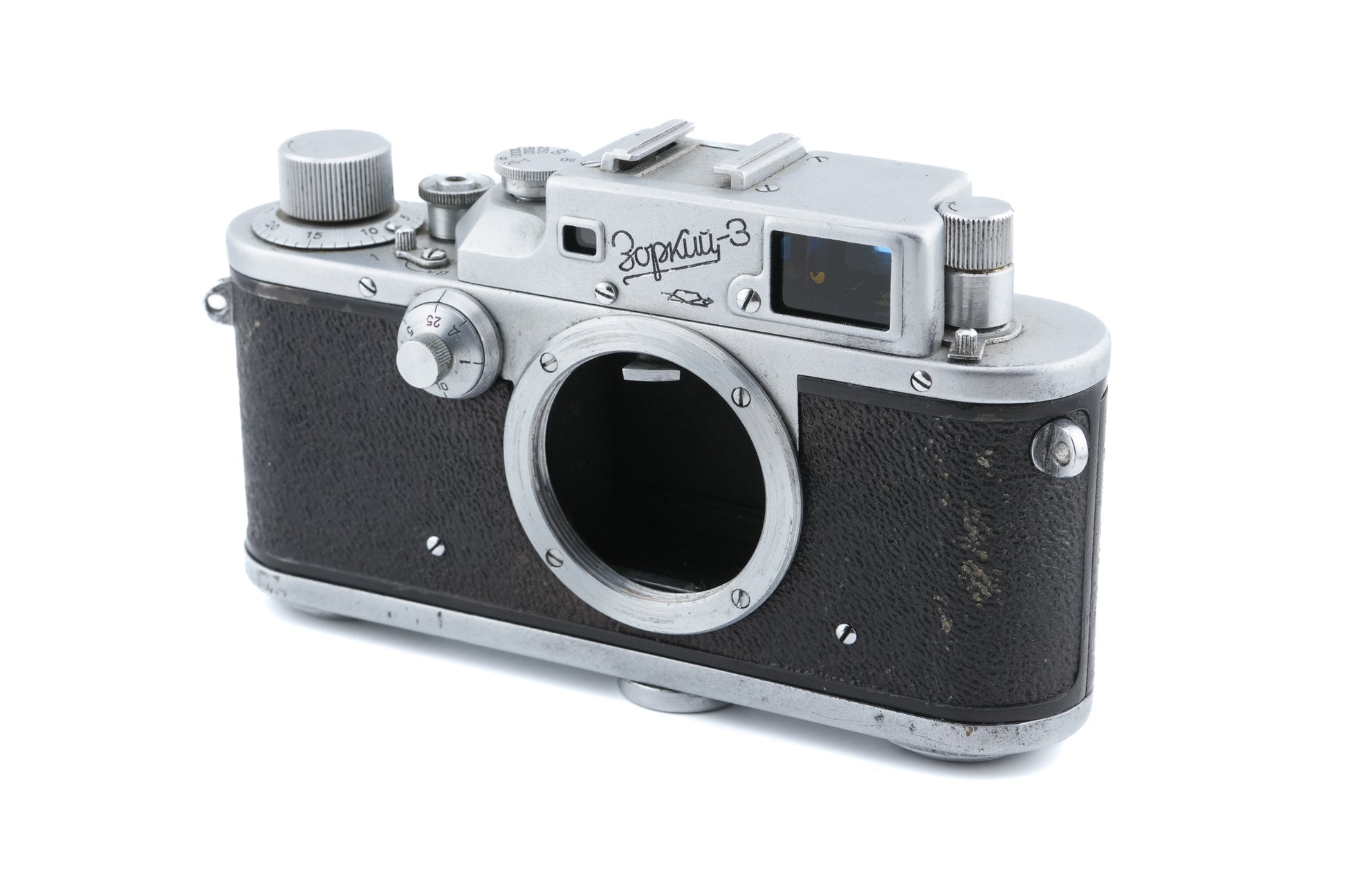 35mm manual focus M39 mount rangefinder camera manufactured by Mechanical Factory of Krasnogorsk in the former USSR from 1956 to 1973. The viewfinder features a diopter adjustment lever. Has a self-timer. Metal body available in silver.