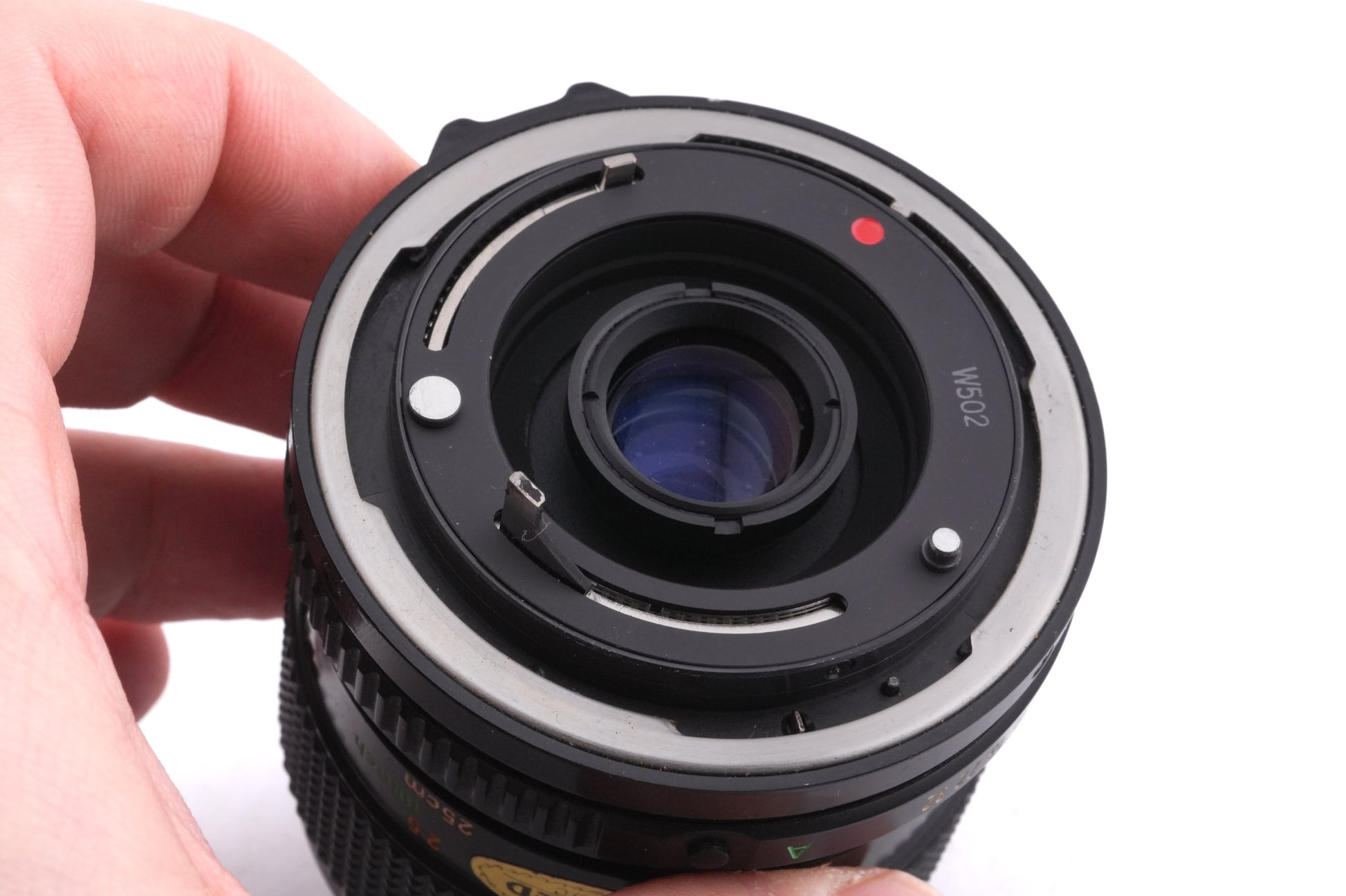 Manual focus macro lens made for FD-mount 35mm SLR cameras introduced by Canon. It uses the newer FDn mounting mechanism. Metal body available in black.