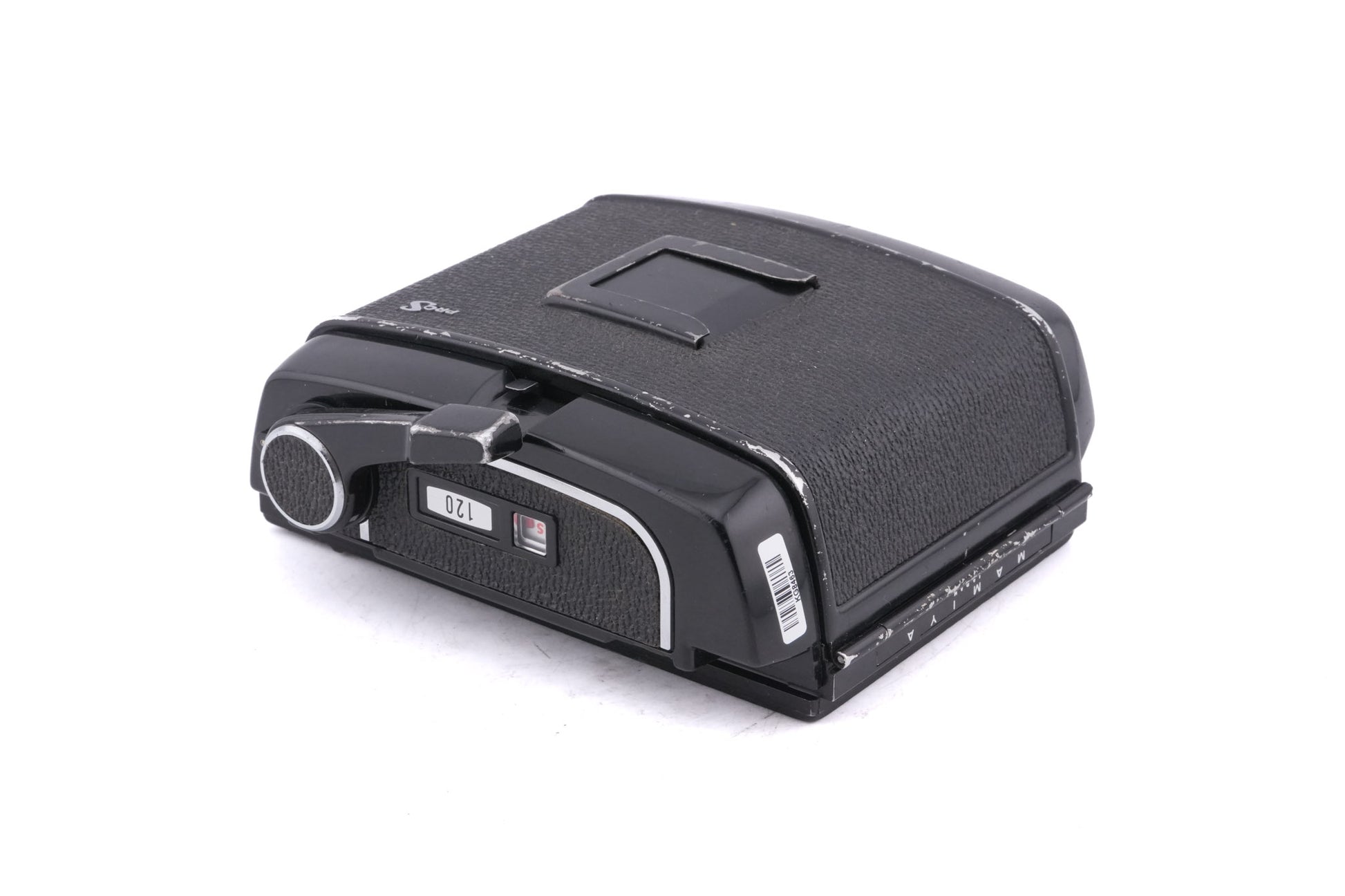 120 film back magazine made for the RB67 medium format cameras introduced by Mamiya. This is the second version announced together with the RB67 Pro-S in 1974. It added a multiple exposure lever under the film advance lever. It takes 10 6x7cm negatives on one roll of 120 film. Metal and plastic body available in black.