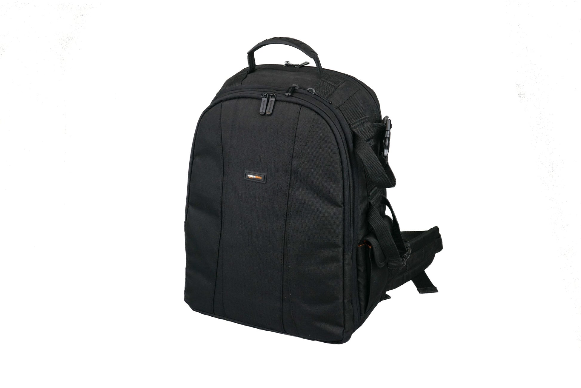 Medium sized camera backpack manufactured by Amazon Basics. Available in black.