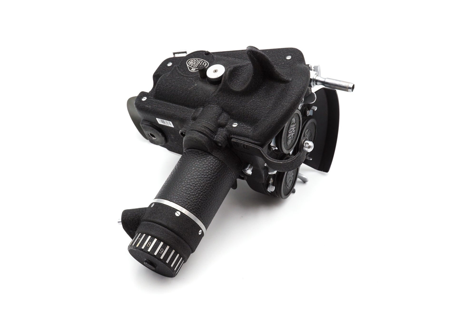 Manual focus super 35 movie film camera with interchangable lenses and film magazines made by Arri in 1960. This model introduced a new transport claw design and a fixed 180º shutter. Metal construction available in black.