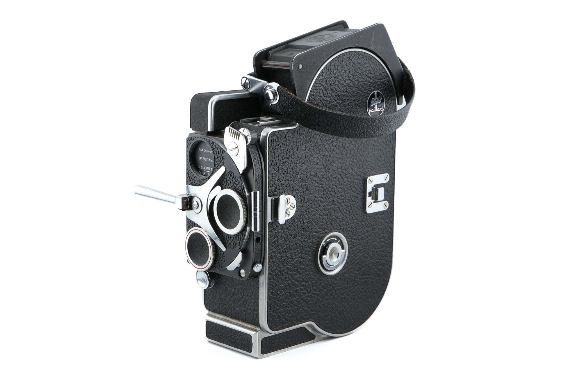 Manual focus 16mm video camera made by Bolex in 1967. It uses a rotating lens mount system allowing for three interchangable lenses to mounted at once. It also features a built-in gelatin filter holder behind the taking lens.