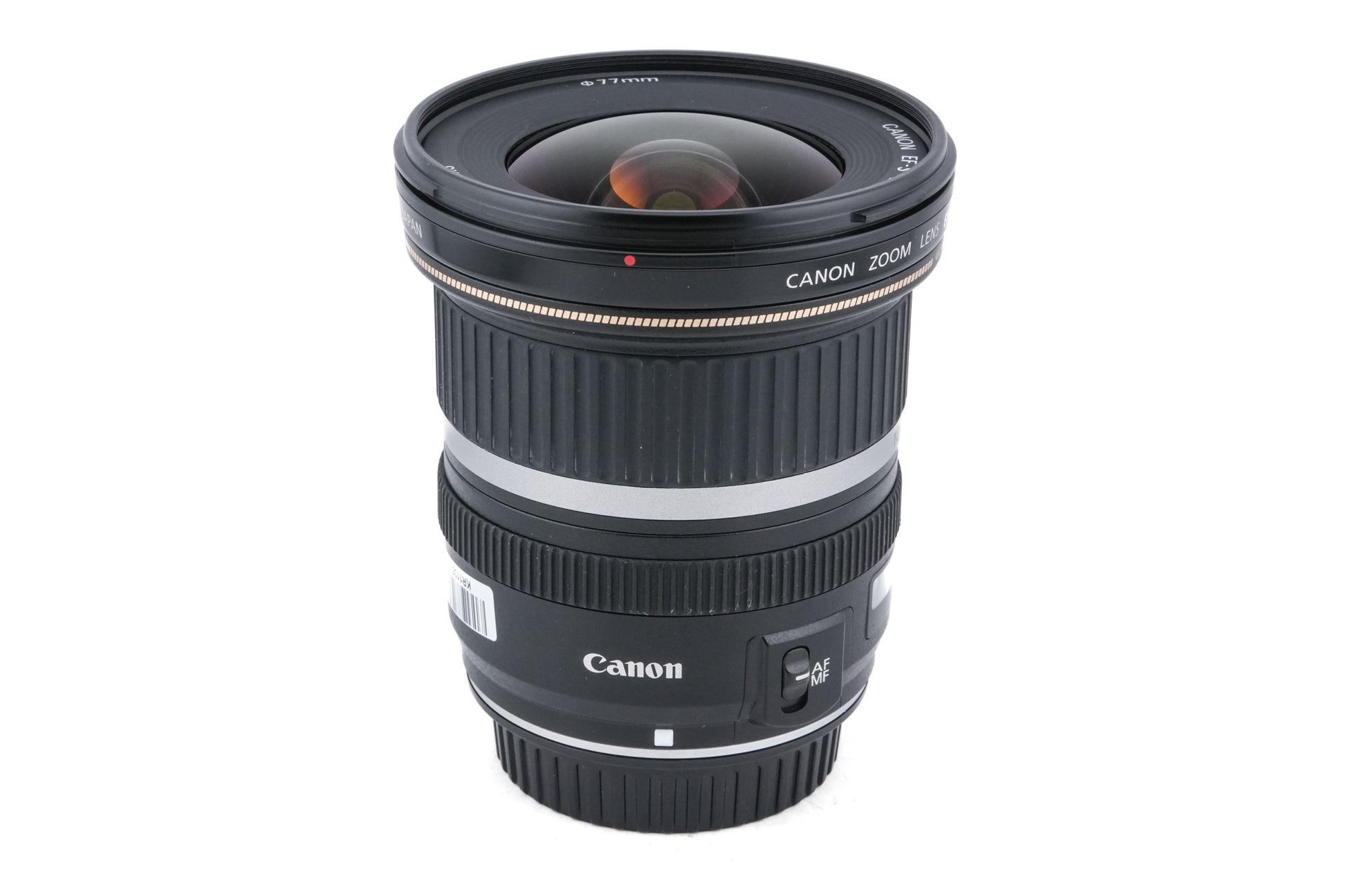 Autofocus wide-angle zoom lens made for EF-S-mount digital SLRs by Canon in 2005. It is designed for APS-C-sized sensors and gives the equivalent field of view to a 15-33mm lens on full frame/35mm. It uses an ultrasonic focusing motor (USM) for autofocus. Plastic and metal body available in black.