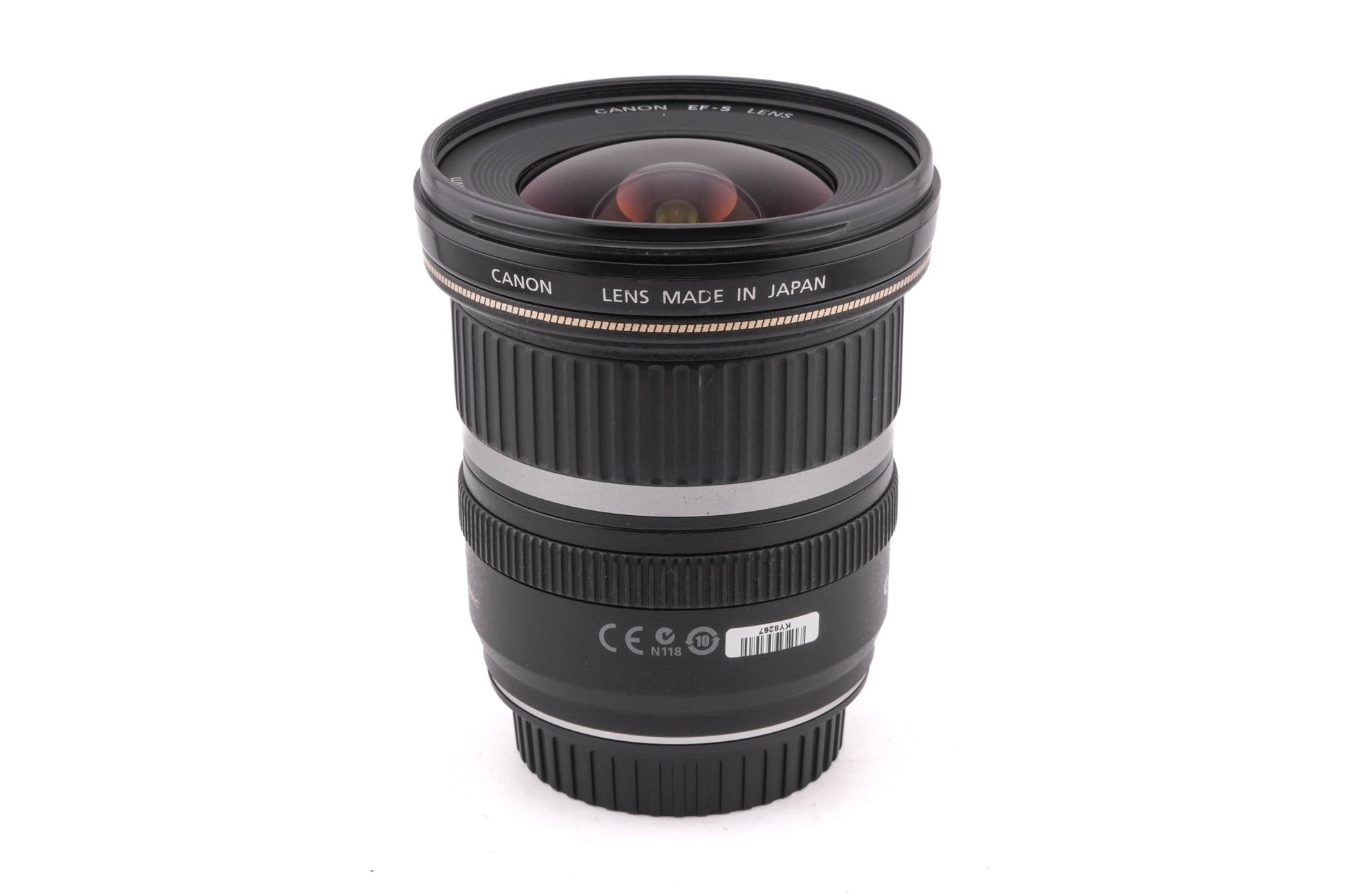 Autofocus wide-angle zoom lens made for EF-S-mount digital SLRs by Canon in 2005. It is designed for APS-C-sized sensors and gives the equivalent field of view to a 15-33mm lens on full frame/35mm. It uses an ultrasonic focusing motor (USM) for autofocus. Plastic and metal body available in black.