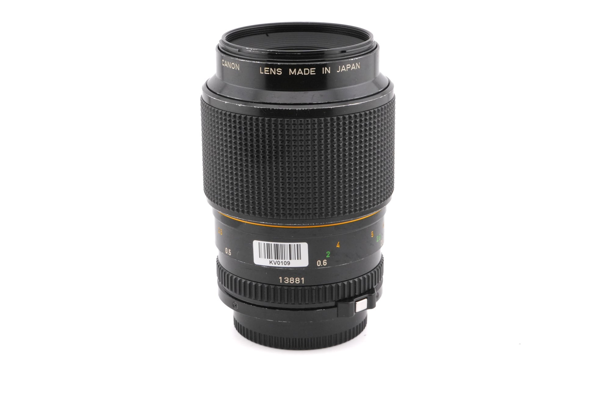 Manual focus telephoto macro lens made for FD-mount 35mm SLR cameras introduced by Canon. It uses Canon's newer FD-mount and has a 1:2 reproduction ratio. Metal body available in silver & black.