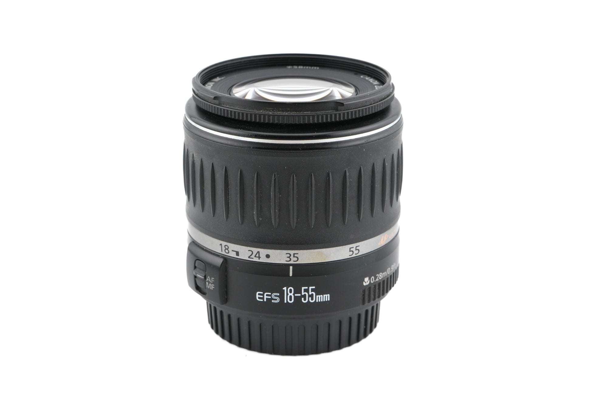 Autofocus standard zoom for Canon EF-S crop sensor DSLRs. The first kit-lens in a line of 18-55mm lenses made by Canon. Uses an ultrasonic autofocus motor. Has an AF/MF switch. Plastic body available in black.
