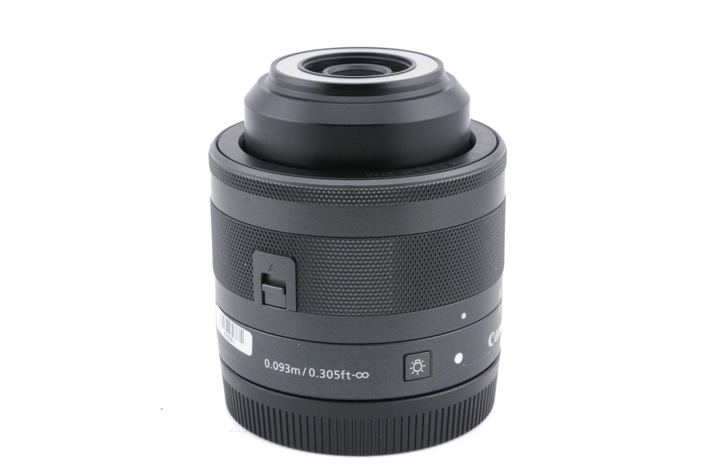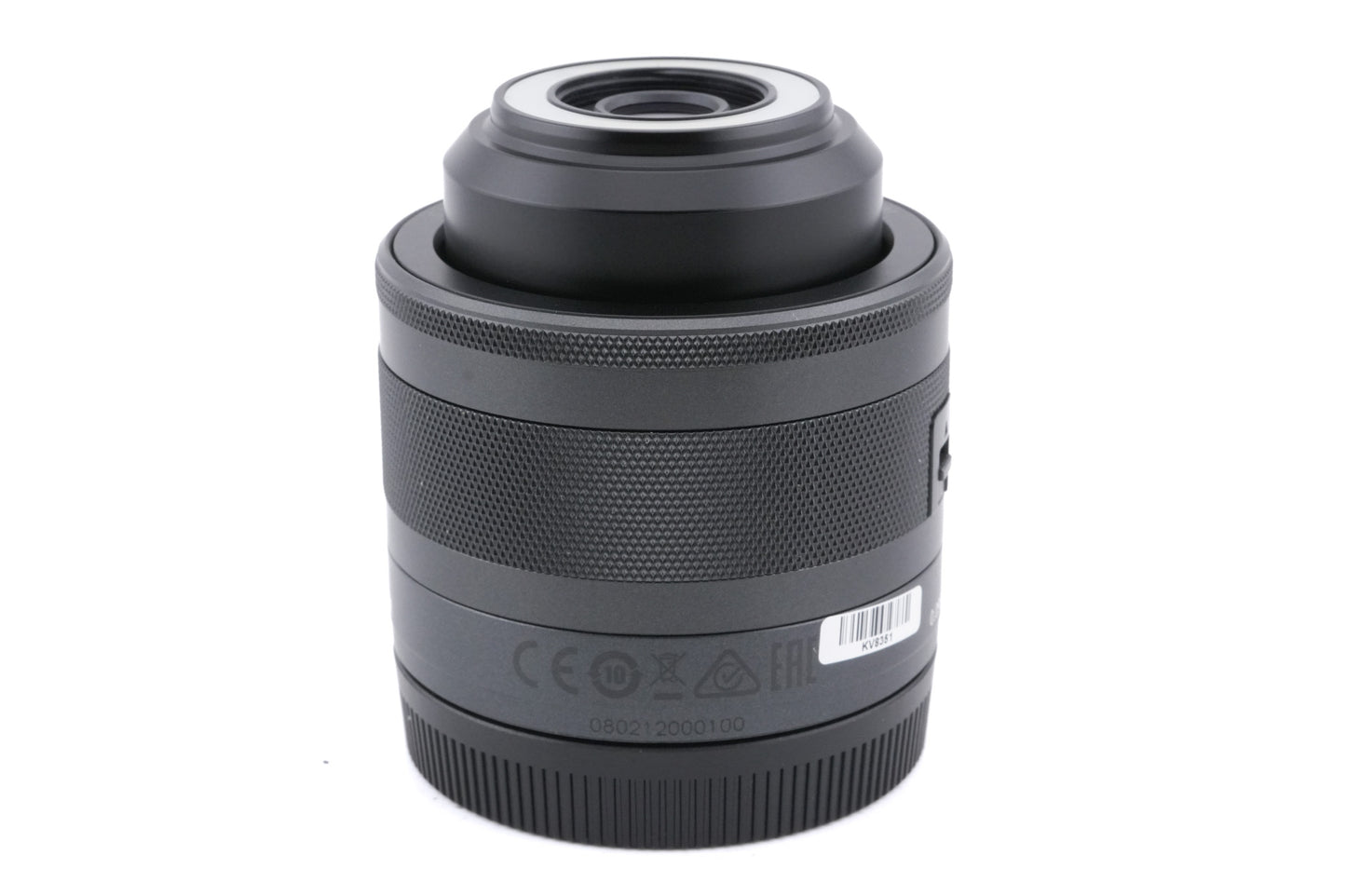 Autofocus macro lens made for EF-M-mount mirrorless digital cameras introduced by Canon. It has a built-in ring light on the front. Plastic body available in black.