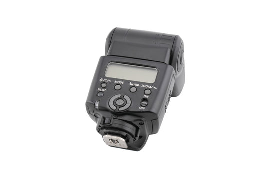 Flash made for EF-mount (D)SLR cameras by Canon. It is capable of using Canon's E-TTL II flash metering system. It has built-in wireless receiver technology and a zooming flash head that covers 24-105mm lenses. The flash head tilts 90º and rotates 180º. Plastic body available in black.