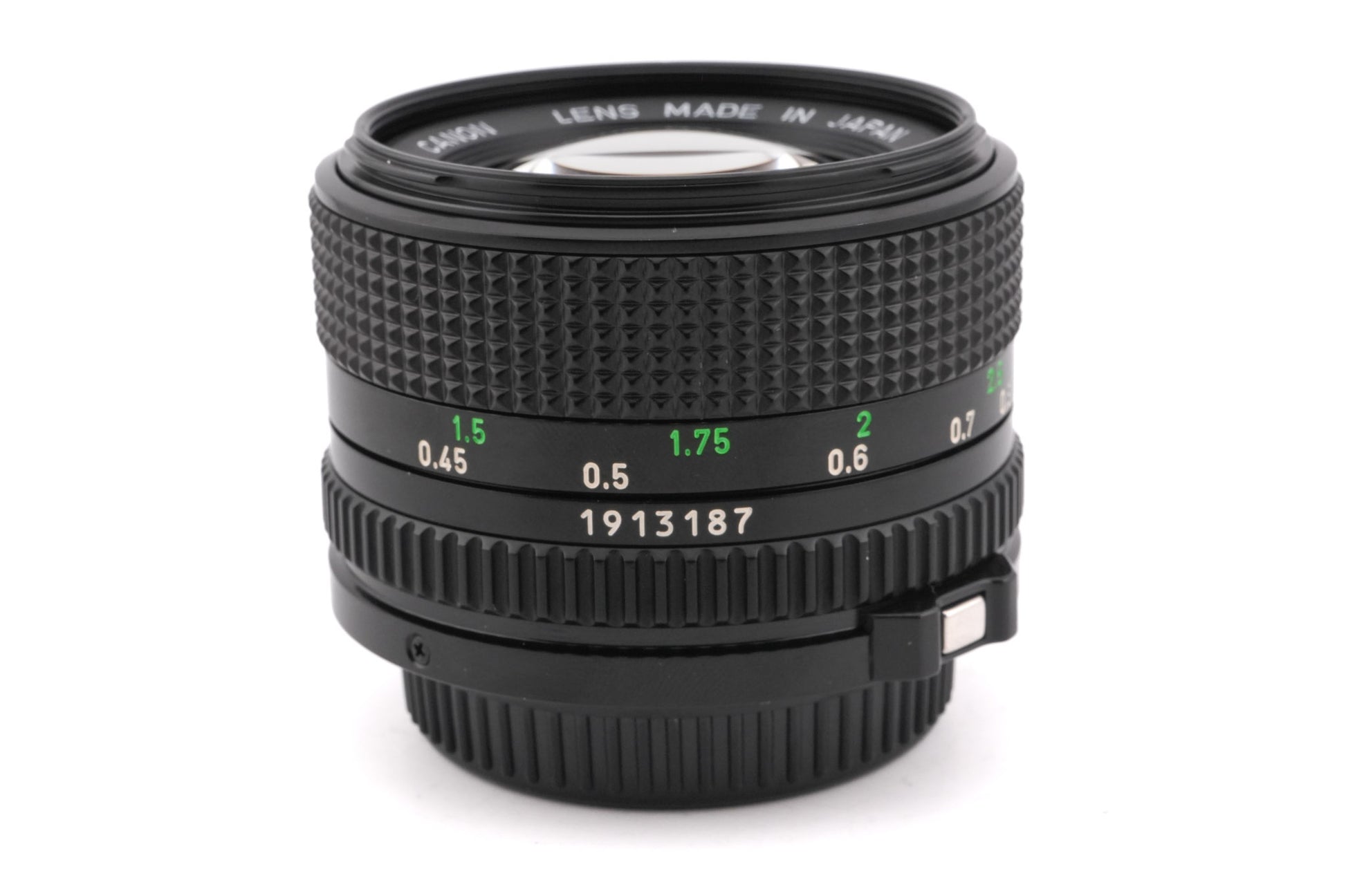 Manual focus normal lens for FD-mount 35mm SLRs by Canon. Intended for low-light photography. Uses Canon's newer locking FDn mount, without the external breech lock and with newer coatings. Metal/plastic body available in black.