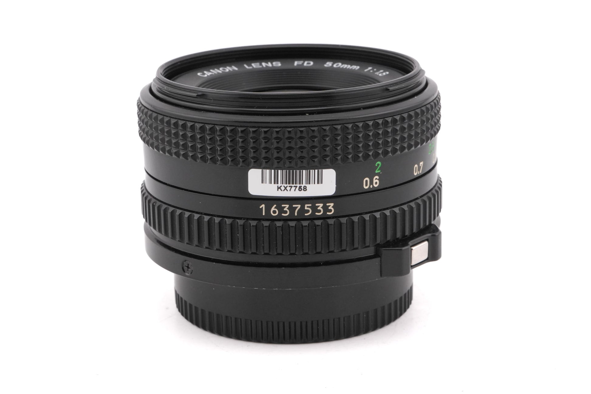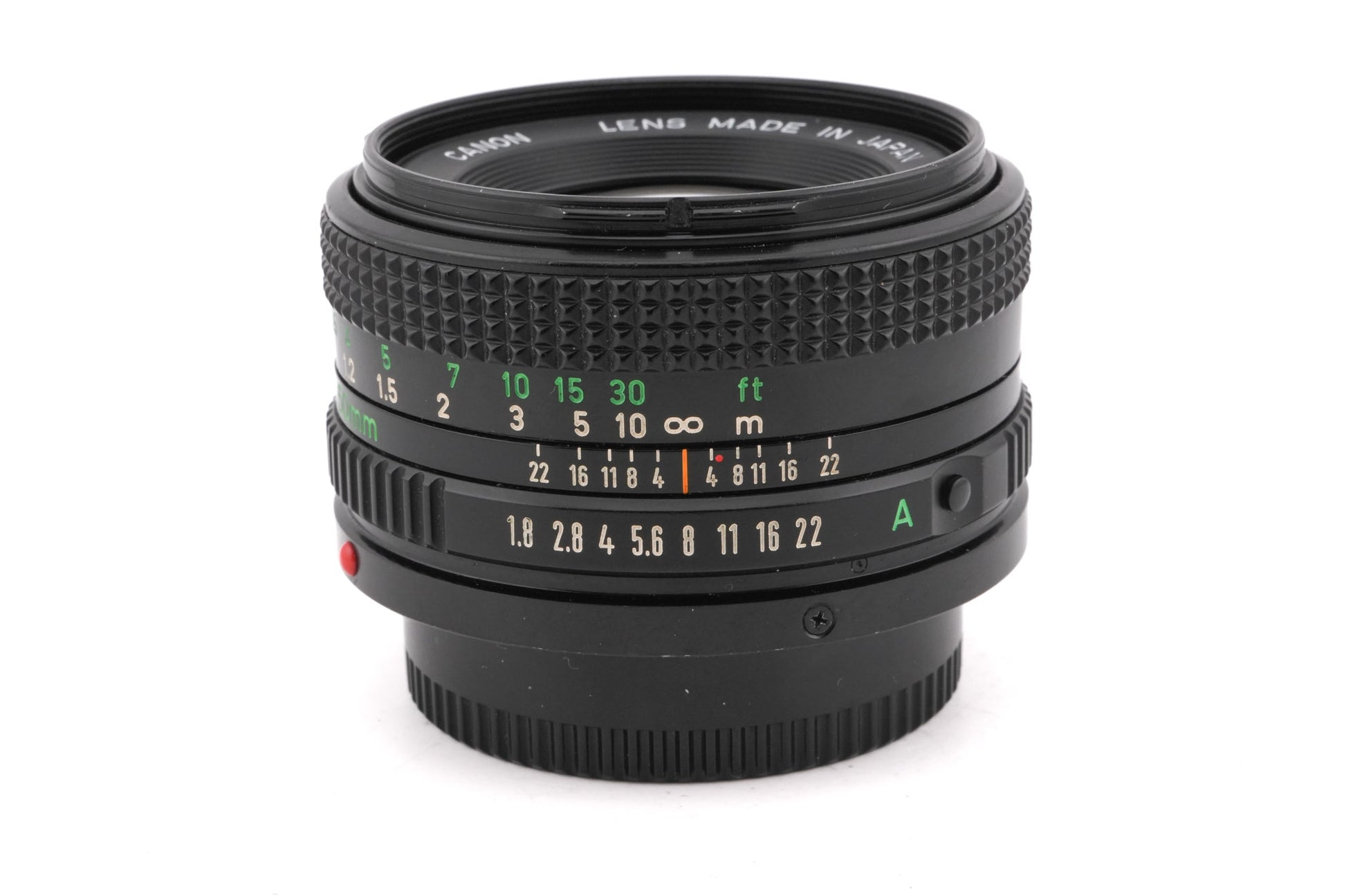 Manual focus normal lens made for FD-mount 35mm SLRs by Canon. It uses the newer style FDn bayonet mounting mechanism. Plastic and metal body available in black.