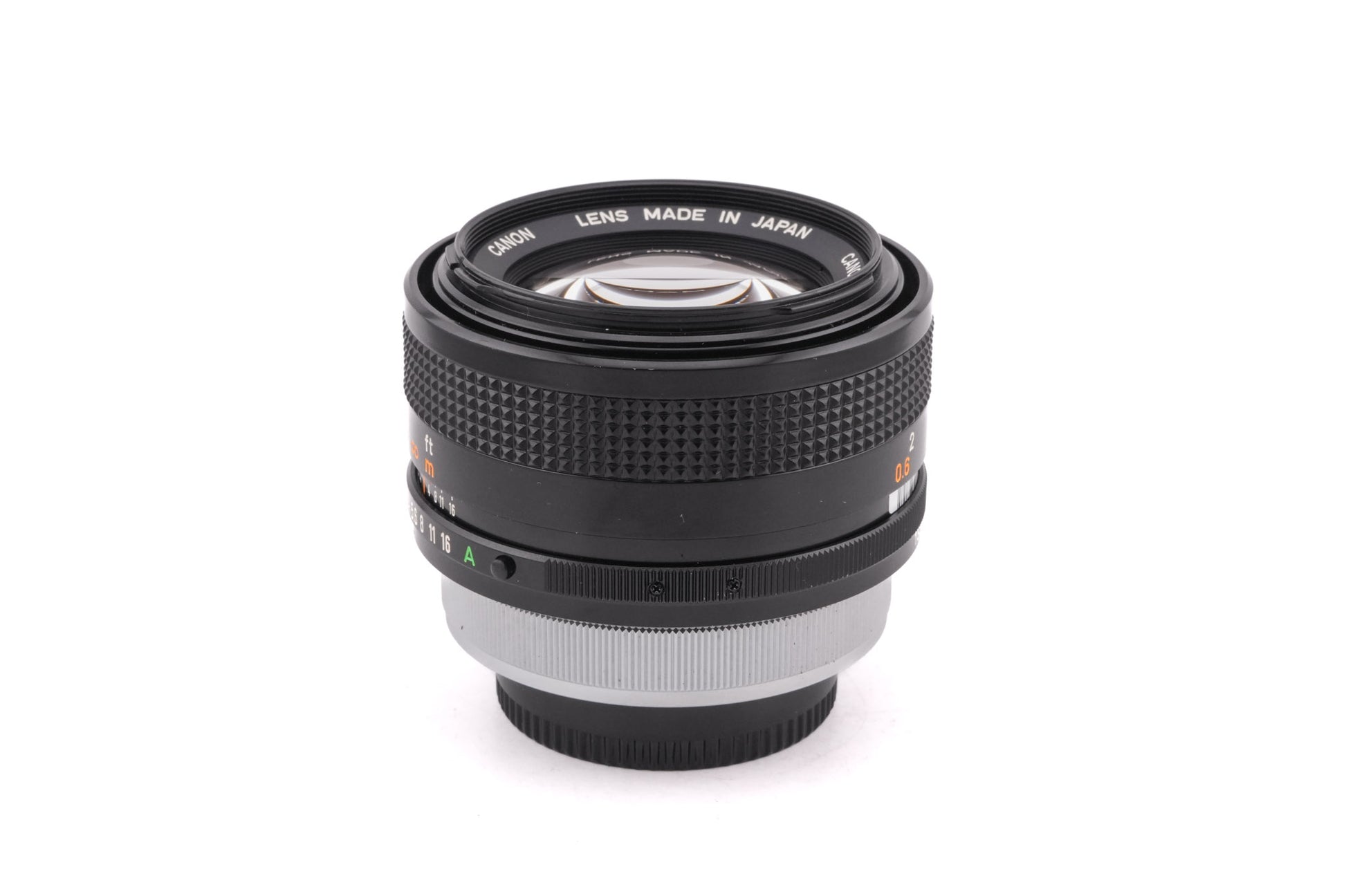 Manual focus normal lens made for FD-mount 35mm SLR cameras introduced by Canon starting in 1975. The optical structure has one aspherical lens element and uses a floating element system. The original price (80000 Yen) is the equivalent of around 1025 Euros in 2025. Metal body available in black.