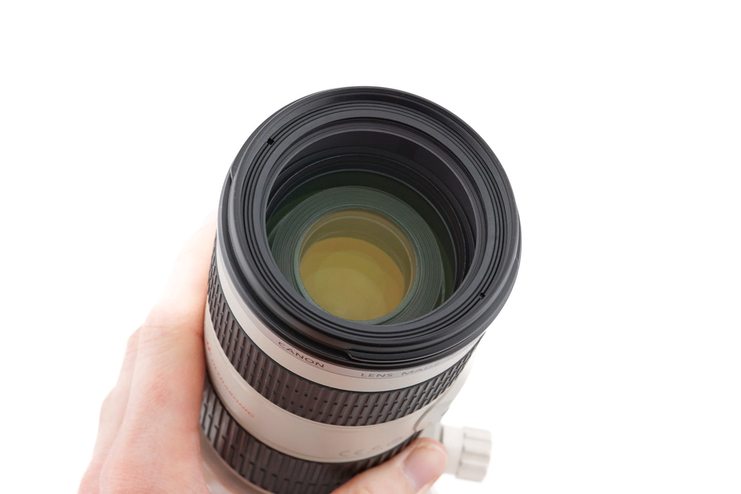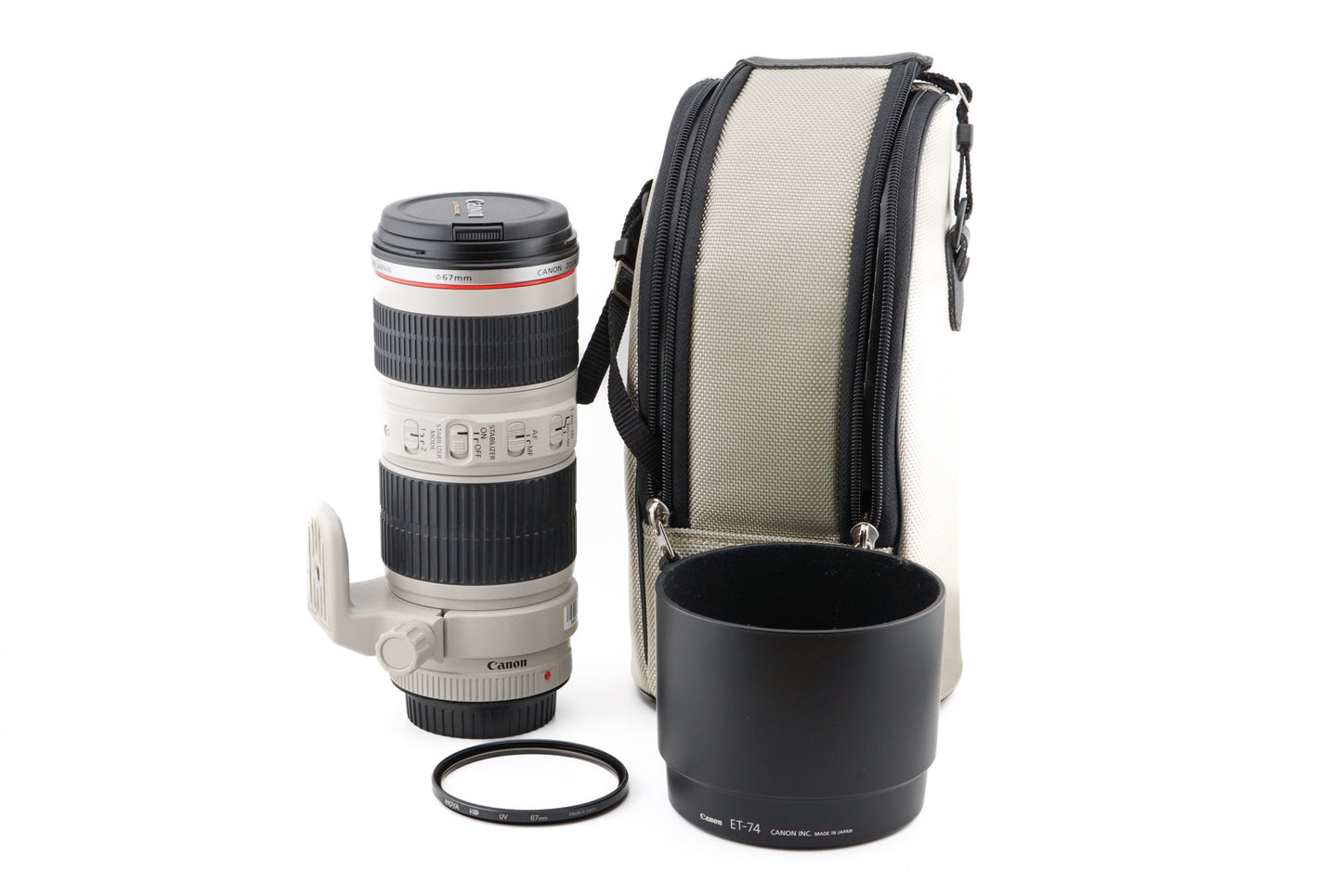 Autofocus telephoto zoom lens made for EF-mount SLRs by Canon starting in 2006. It is part of their L series of professional lenses and has a weather-sealing gasket. It also has an image stabilizer (IS), ultrasonic focusing motor (USM), removable tripod mount, and a focus limiting system. Metal body available in beige.