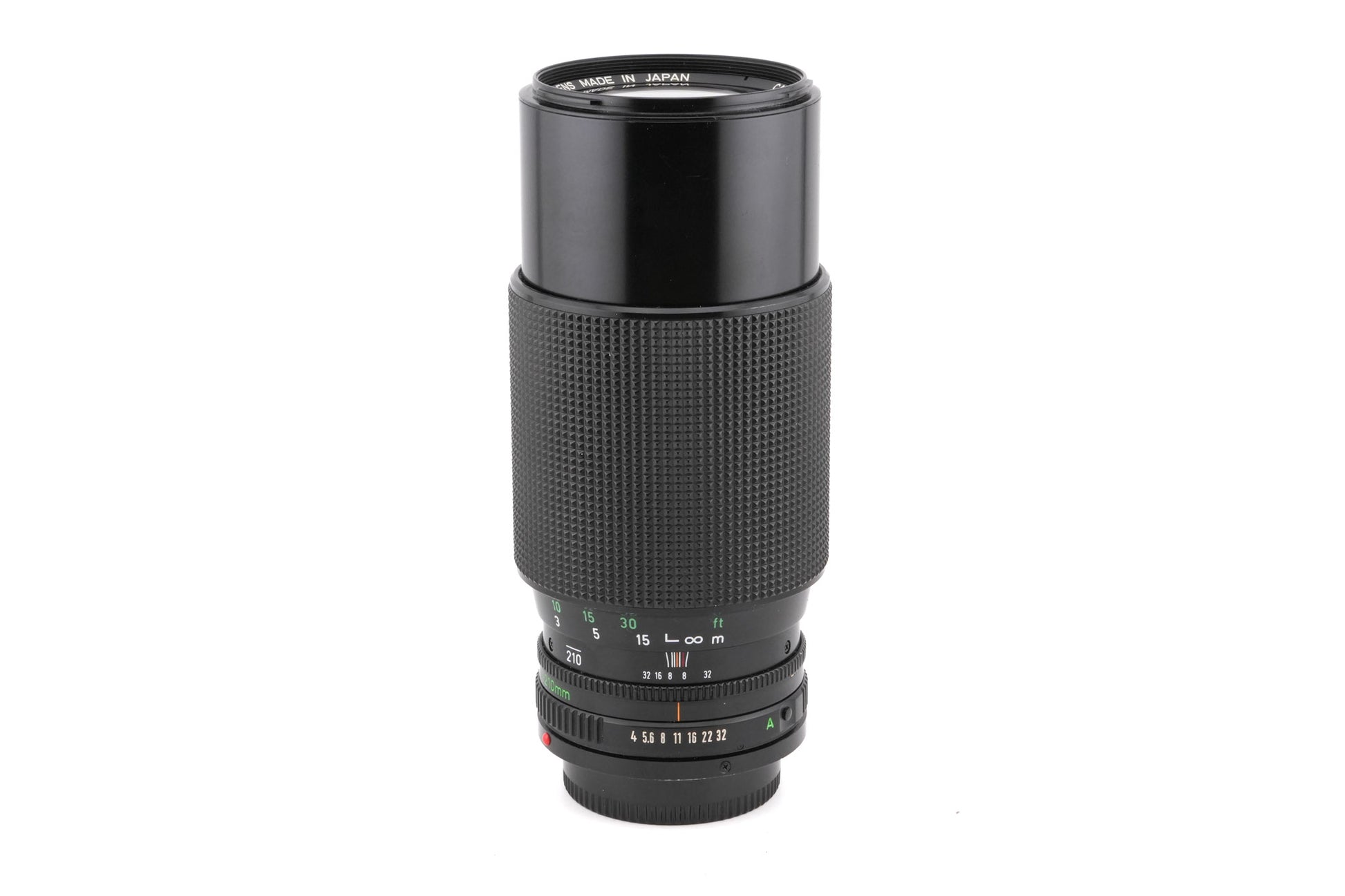 Manual focus telephoto zoom lens made for FD-mount SLRs by Canon in 1980. It uses the newer FDn bayonet mounting system and Canon's Super Spectra Coatings. The original price (59,000 Yen) is equivalent to around 550 Euros in 2023. Metal and plastic body available in black.
