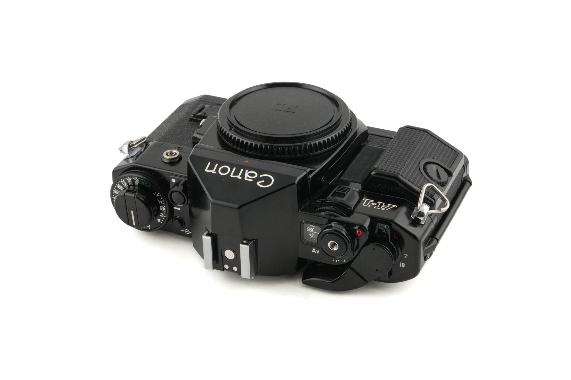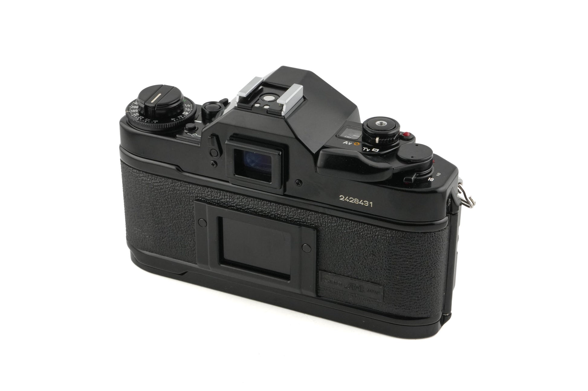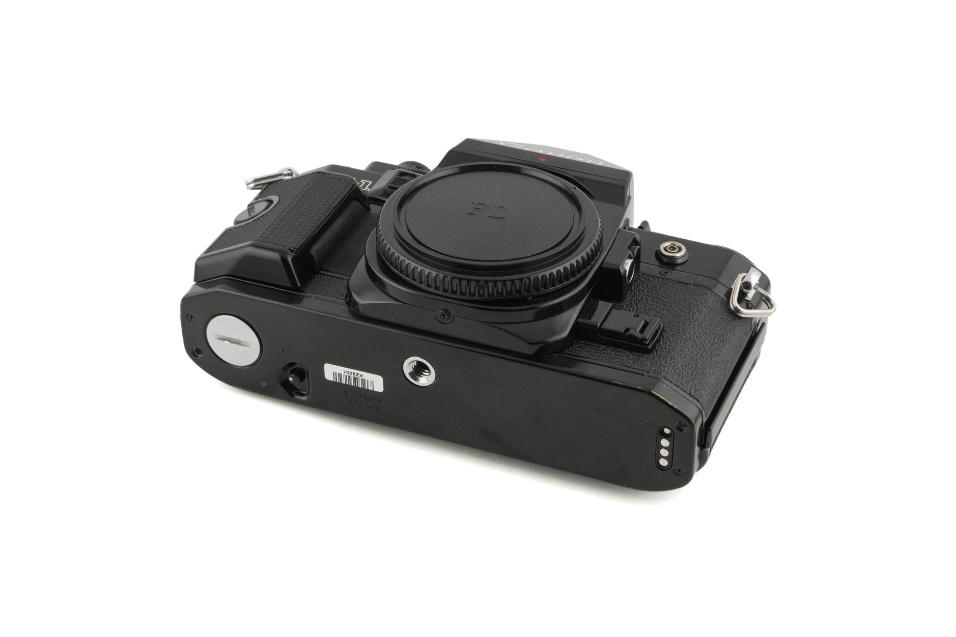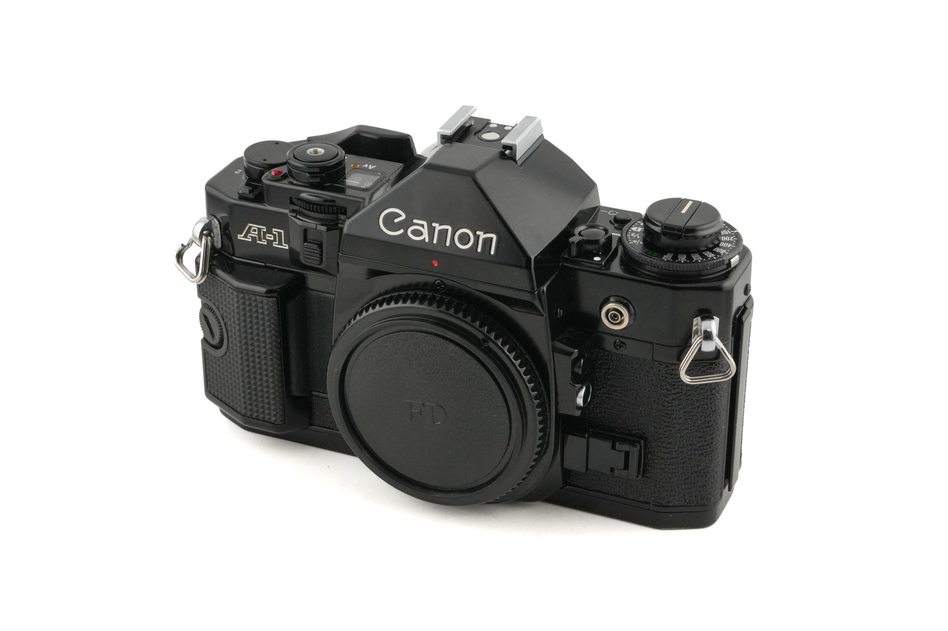 Manual focus 35mm FD-mount SLR camera released by Canon in 1978. The A-1 features several different auto exposure modes such as shutter priority, aperture priority, and programmed fully-automatic mode. It was the first SLR camera to feature fully programmed auto exposure and the first to have the four standard exposure modes seen in modern digital cameras (PSAM). Metal body available in black.