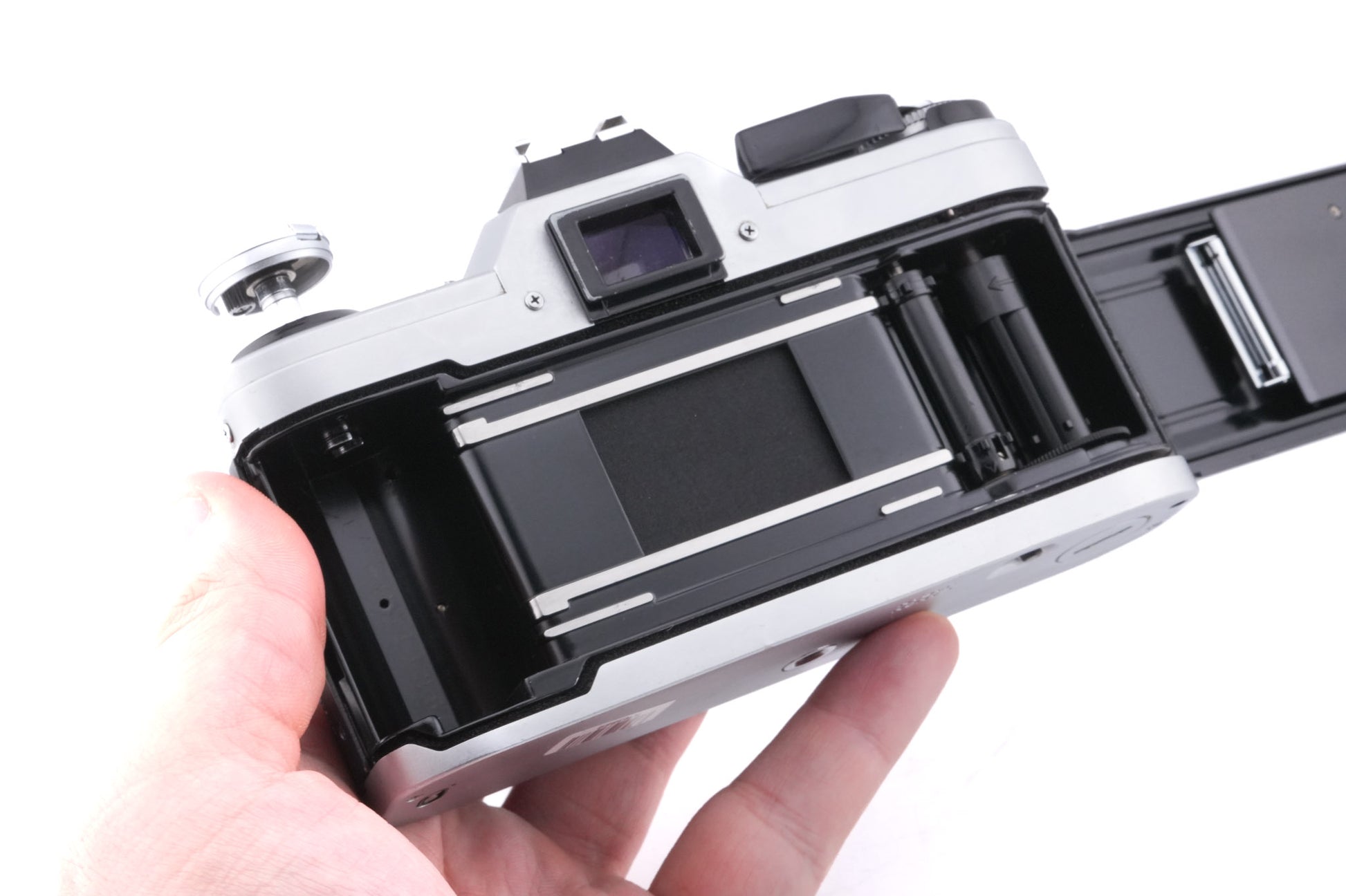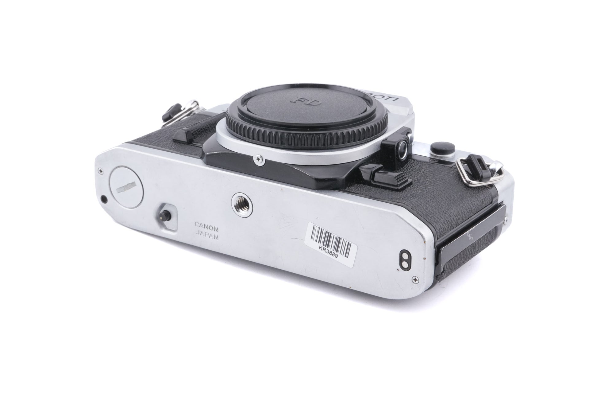 Manual focus FD-mount 35mm SLR camera released by Canon in 1976. It was the first SLR to feature a microprocessor for calculating exposure data. It features shutter priority autoexposure and fully manual exposure. Metal and plastic body available in silver and black.