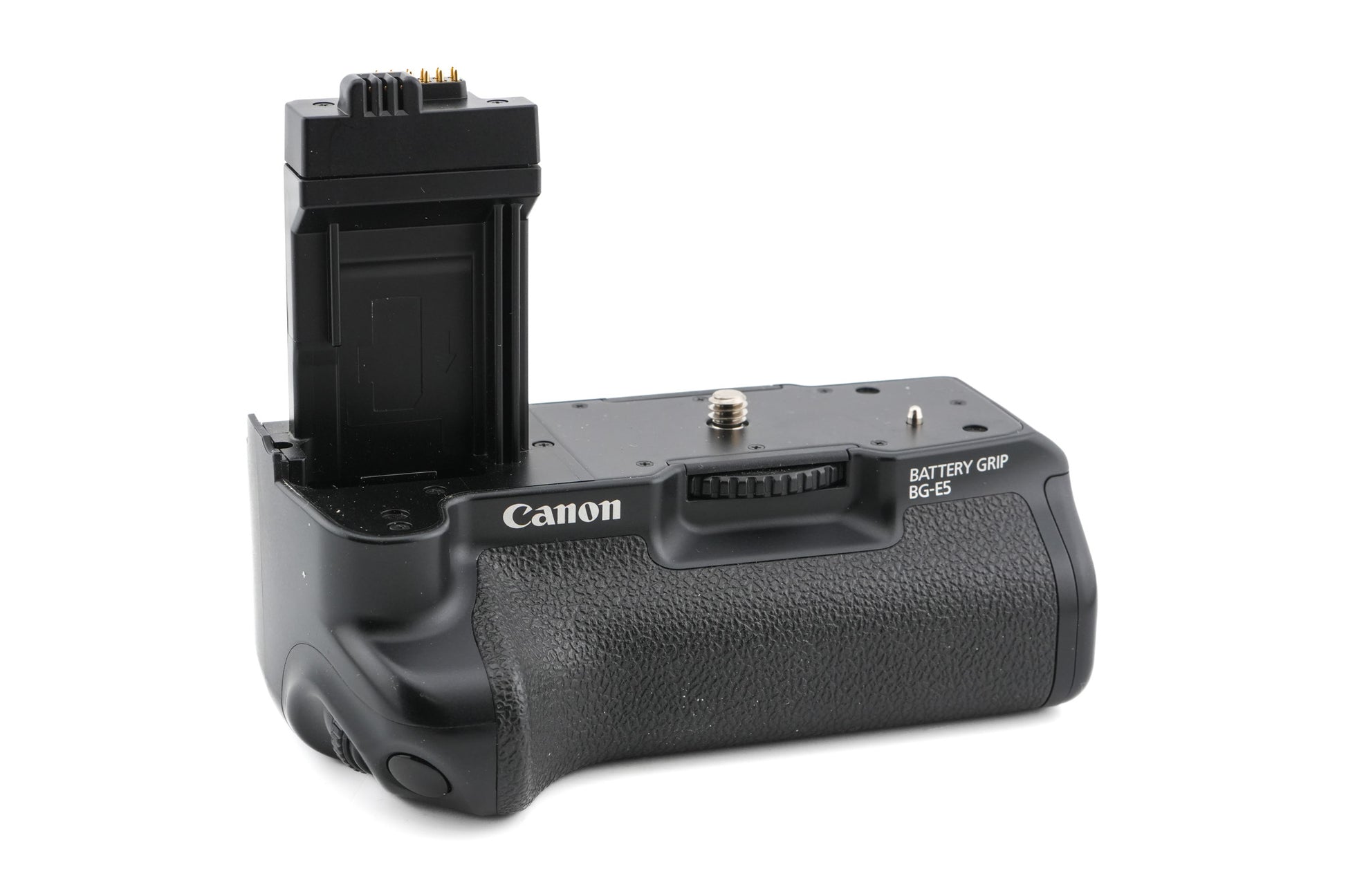 Battery grip for Canon 450D, 500D and 1000D cameras made by Canon. Powered by LP-E5 batteries when used with the BGM-E5L holder or AA batteries with the BGM-E5A holder. Black plastic construction.