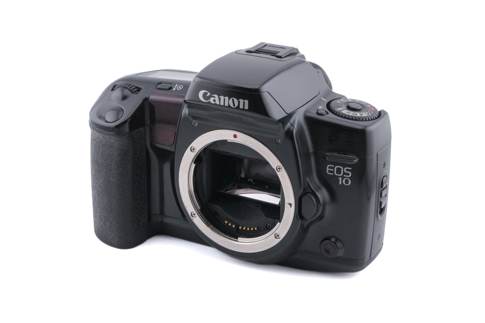 Autofocus EF-mount 35mm SLR camera released by Canon in 1990. It uses a Multi-BASIS AF sensor with a 3-point autofocus system. It is known as EOS 10 S in Americas and as EOS 10 QD in Japan. Plastic body available in black.
