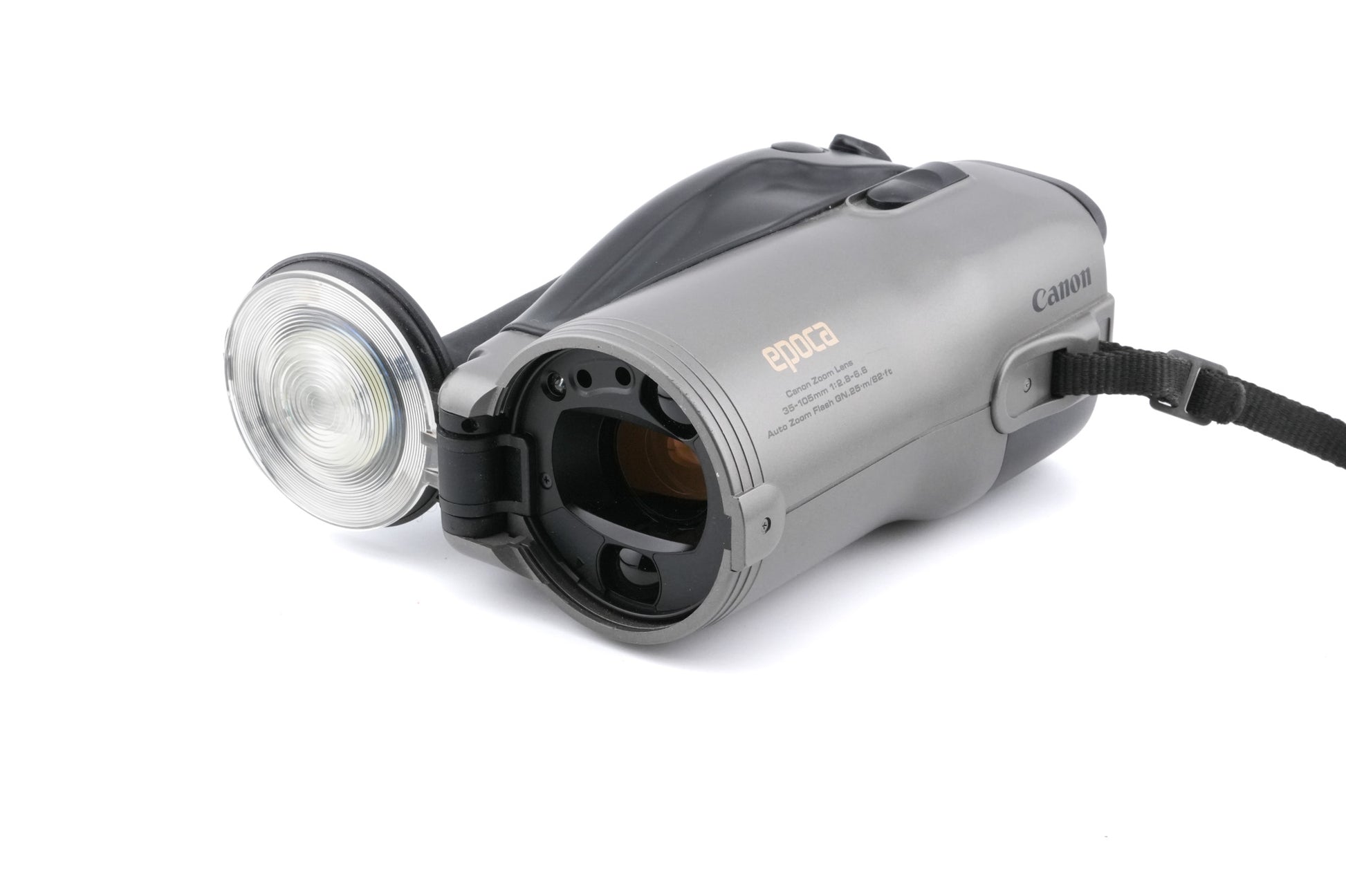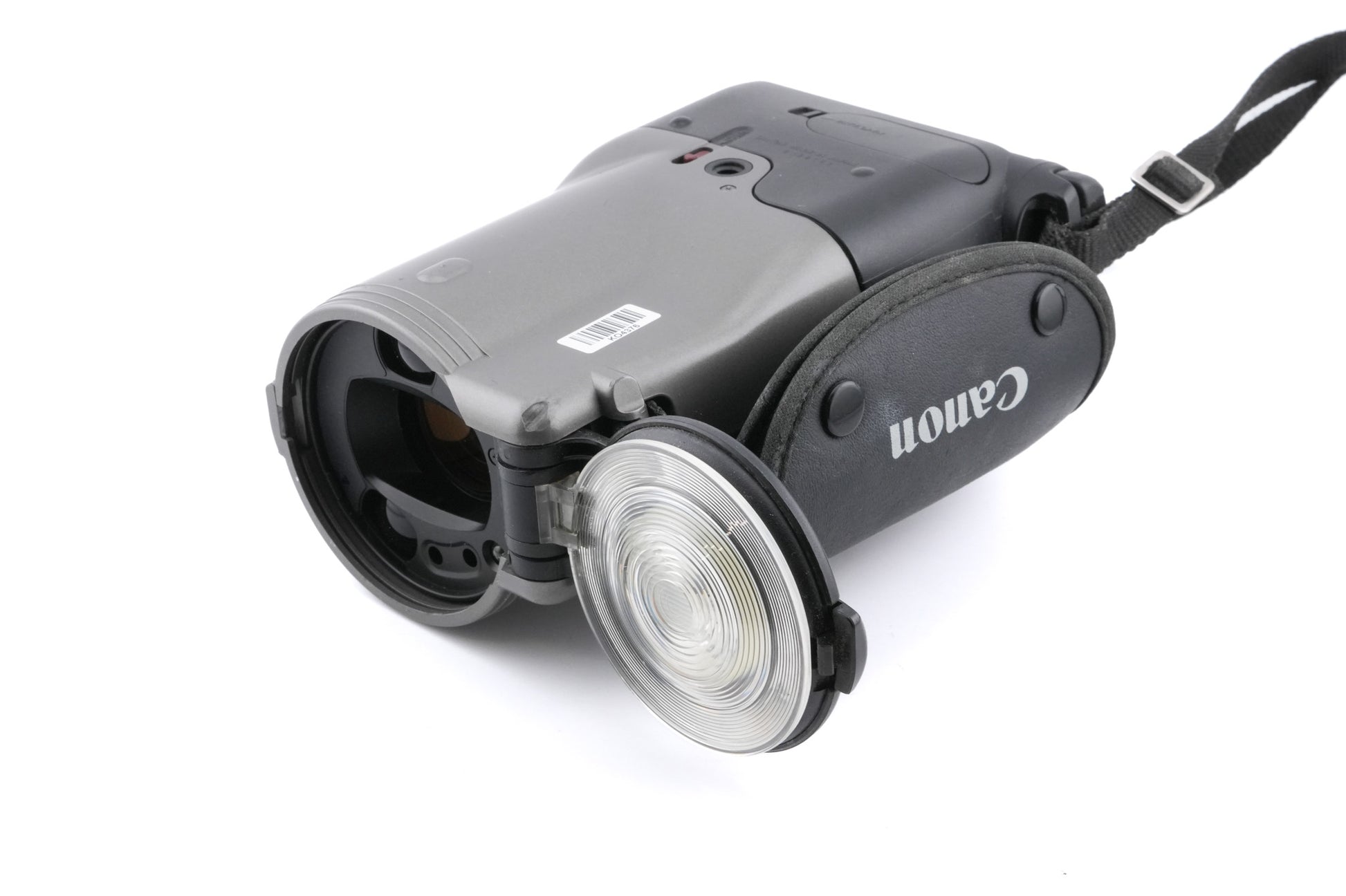 Autofocus 35mm point-and-shoot camera released by Canon in 1990. Camcorder-esque design with built-in zooming flash in the lens cover. Known as Photura in North America. Plastic body available in gray & black.