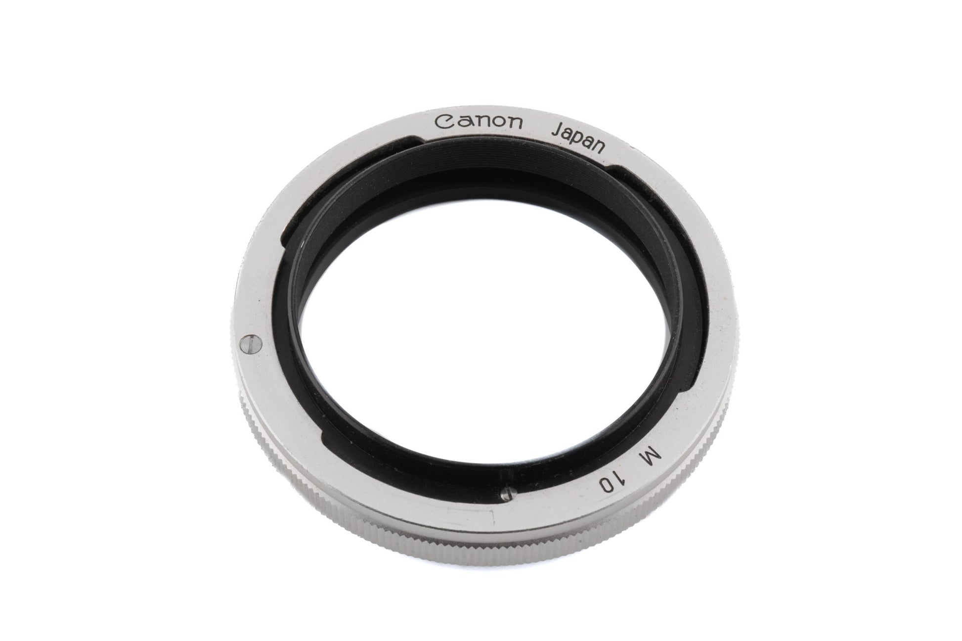 10mm extension tube made by Canon for Canon FD 35mm SLRs. This extension tube has no coupling to stop down the lens and uses the older breech-lock style mounting mechanism. Black and silver grey metal body.