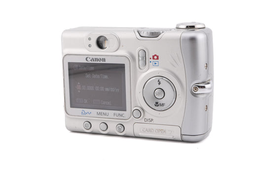 Autofocus digital point-and-shoot camera released by Canon in 2005. It improved on its predecessors by being almost 20% smaller and having a longer zoom reach. The lens gives the equivalent field of view of 35-140mm on full frame / 35mm. It can record 480p video at 10 fps. It can only use SD cards with capacities of 1 GB or less. Plastic body available in silver.