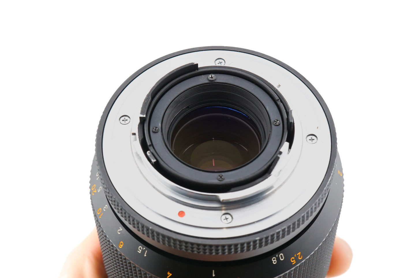 Manual focus telephoto macro lens made for Contax/Yashica mount 35mm SLR cameras introduced by Carl Zeiss in 1984. The optical structure uses a floating element design. It has a 1:1 macro reproduction. This lens is of the older AE variant with “ninja star” bokeh and no support for shutter priority or program modes. Metal body available in black.