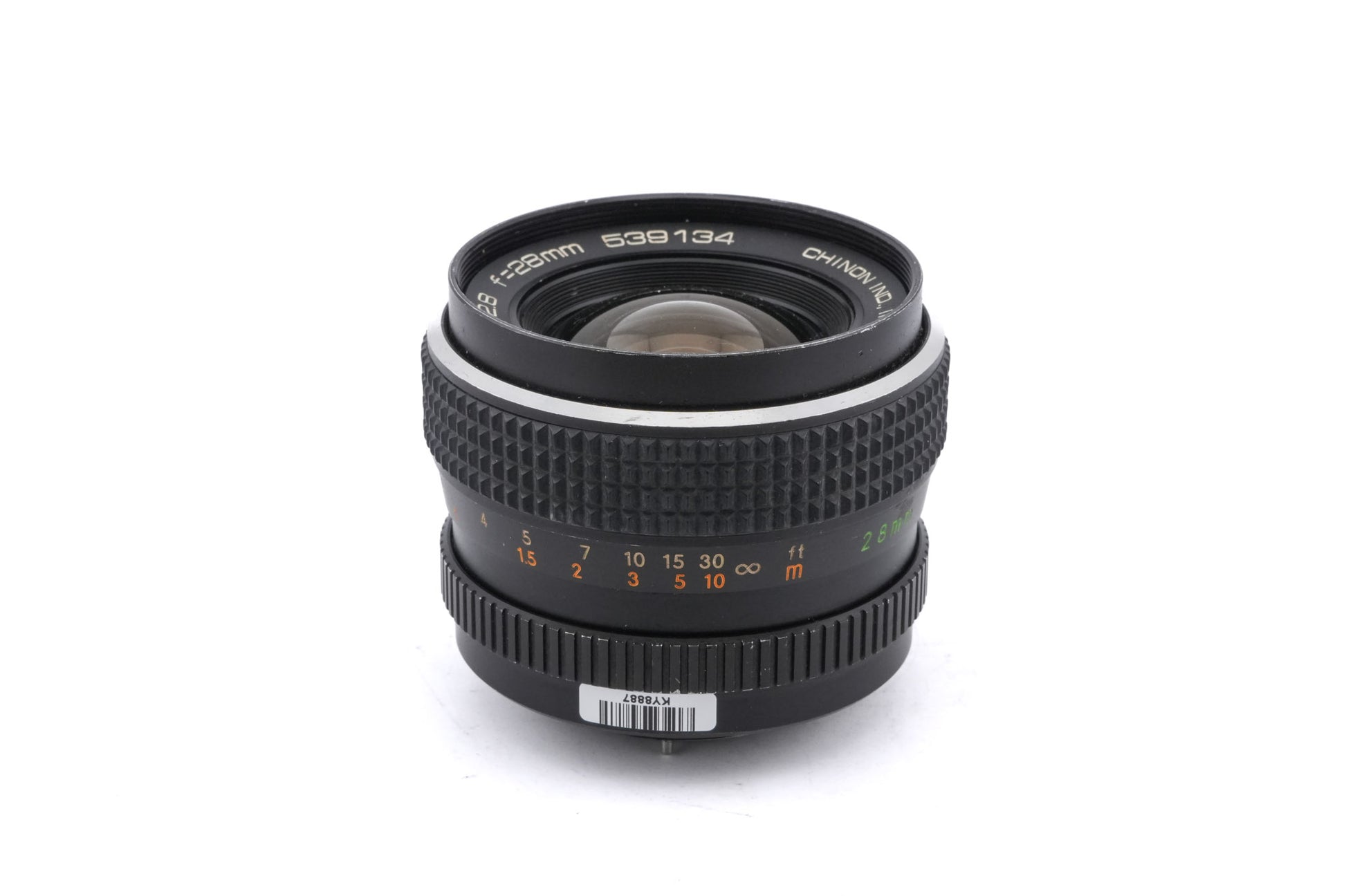 Manual focus wide-angle lens made for M42 screw mount 35mm SLR cameras by Chinon. Metal body available in black.