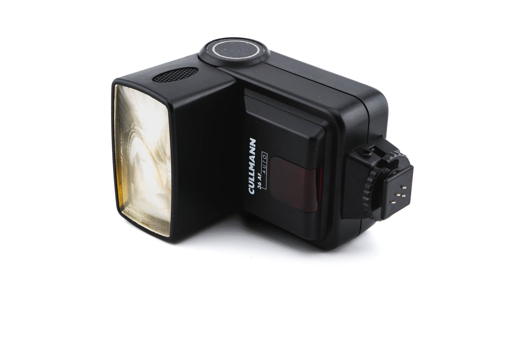 36 AF Auto flash made by Cullmann. Simple and relatively compact flash for Minolta AF system film bodies. Plastic construction in black finish.