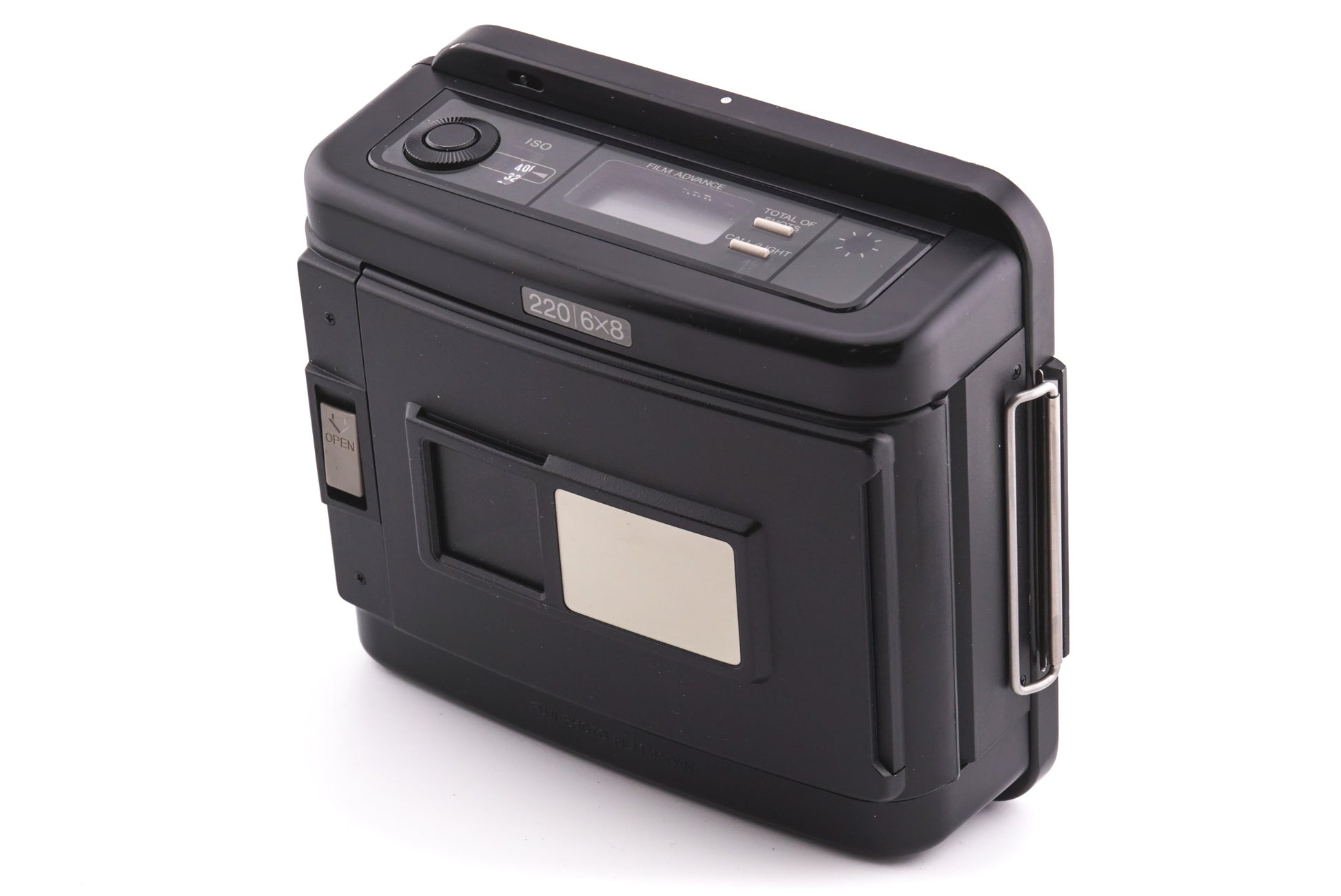 220 roll film holder for Fuji GX680 series cameras. Motorized film advance and manual ISO set in 1/3 increments.