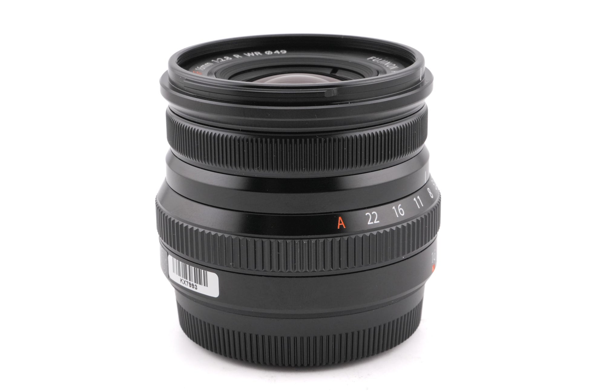Autofocus wide angle lens made for X-mount digital mirrorless cameras by Fujifilm. It is designed for APS-C-sized sensors and gives the equivalent field of view to a 24mm lens on full frame/35mm. It has a weather-resistant (WR) gasket and a dedicated aperture ring (R). Metal body available in black and silver.