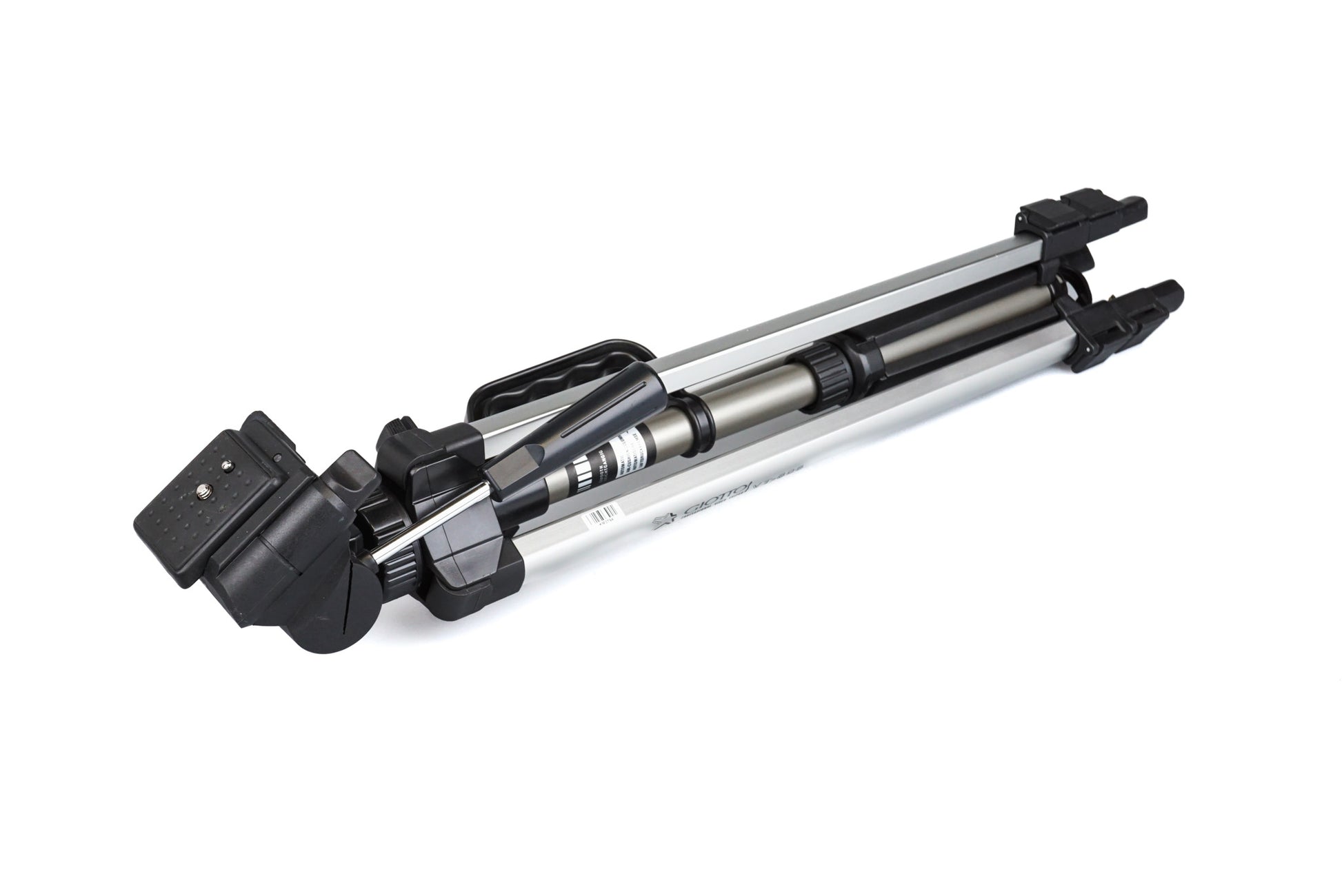 Tripod for camera bodies and lenses with 1/4" threads made by Giottos. Aluminium construction available in silver with black accents.